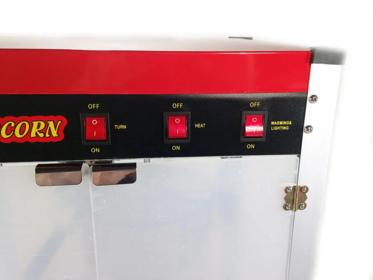 На панели управления расположены три функциональные кнопки: подсветка, подогрев дна и подогрев чаши, что позволяет поддерживать оптимальную температуру попкорна после приготовления.