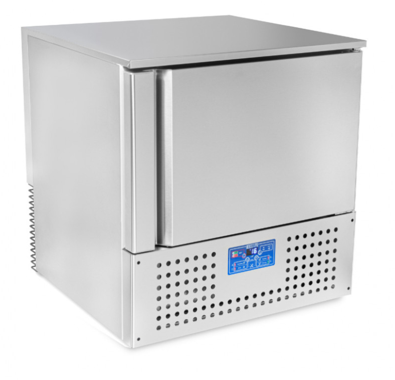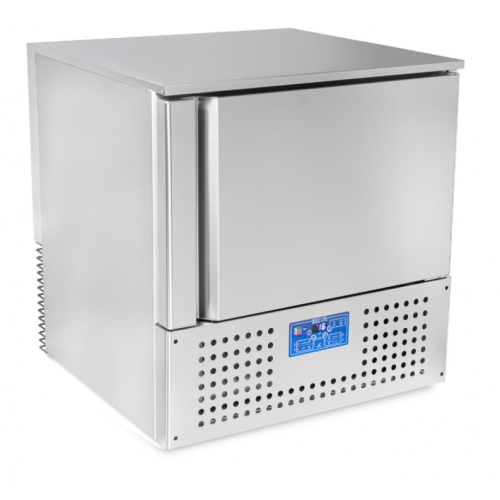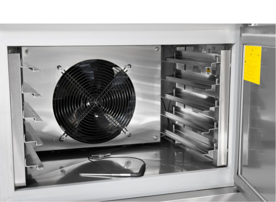Оборудование имеет пять уровней, каждый уровень соответствует размеру гастроемкости 530х325мм(GN 1/1)/600х400мм. Материал изготовления – нержавеющая пищевая сталь AISI 304. Температурный режим, при котором работает шкаф шоковой заморозки -30/-40 °С. Внутри оборудования есть мощный вентилятор, благодаря которому продукция быстро замораживается или охлаждается. Присутствует термощуп для контроля температуры внутри.