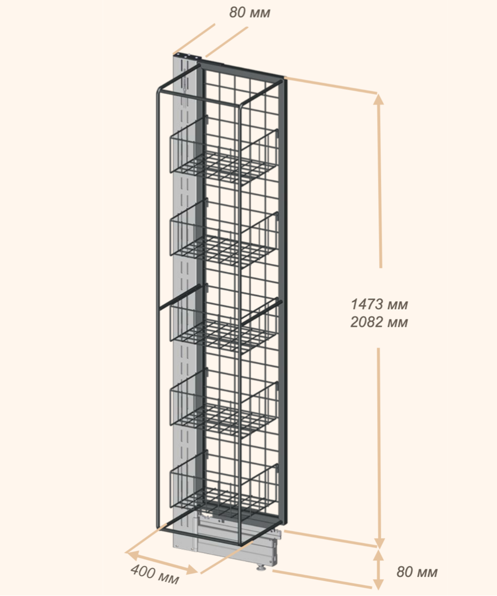 | Комплектация | совместима только с ногой 80 мм и подставкой 80 мм; каркас из трубы 20х20 мм; проволочная стенка; проволочные корзины: 5 шт. на высоту 1473 мм, 8 шт. на -2082 мм. |