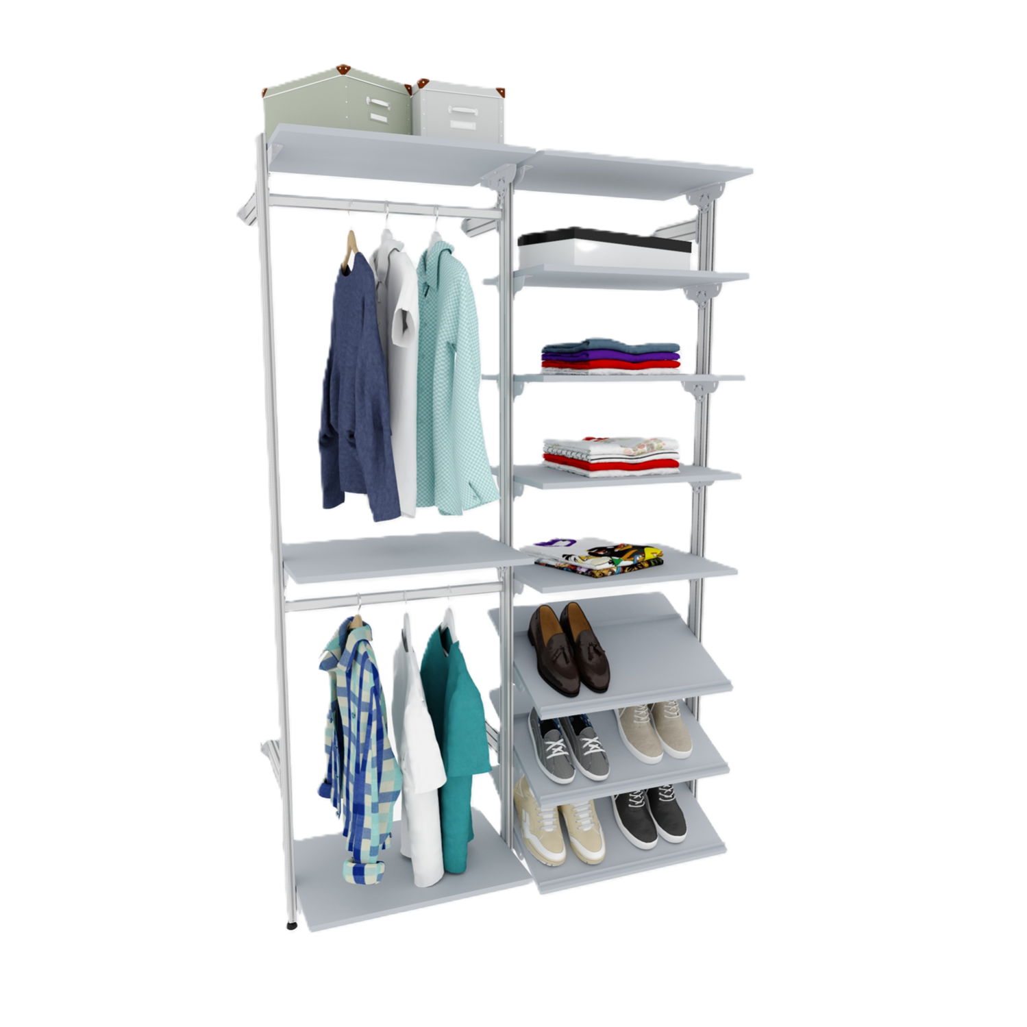 | Комплектация | модуль 1 стойка базовая гардеробной системы SS (алюминий анодированный + комплектующие) 3 шт., модуль 1.1 накладка на стойкую базовую 2 шт., модуль 2.1 (600,800) полка 600,800х450 мм 8 шт. модуль 2.2 (600,800) полка для обуви 600,800х450 мм 3 шт. модуль 4.1 (600,800) труба на стойку 600,800 мм 2 шт. |