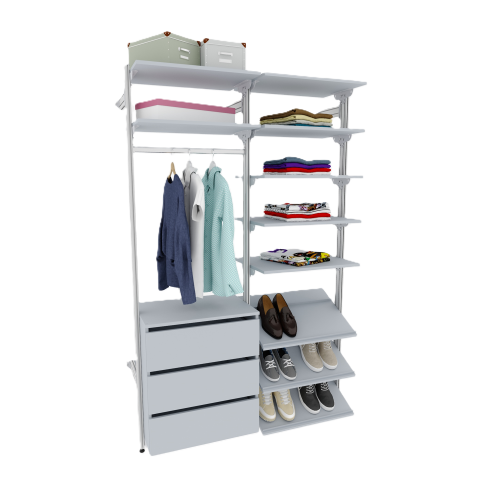 | Комплектация | модуль 1 стойка базовая гардеробной системы SS (алюминий анодированный + комплектующие) 3 шт., модуль 1.1 накладка на стойкую базовую 2 шт., модуль 2.1 (600,800) полка 600,800х450 мм 7 шт. модуль 2.2 (600,800) полка для обуви 600,800х450 мм 3 шт. модуль 3.3 (600,800) тумба на 3 ящика 600,800х450х692 мм 1 шт., модуль 4.1 (600,800) труба на стойку 600,800 мм 1 шт. |