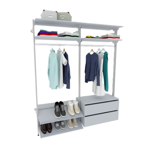 | Комплектация | модуль 1 стойка базовая гардеробной системы SS (аллюминий анодированный + комплектующие) 3 шт., модуль 1.1 накладка на стойкую базовую 2 шт., модуль 2.1 (600,800) полка 600,800х450 мм 4 шт. модуль 2.2(600,800) полка для обуви 600,800х450 мм 2 шт., модуль 3.2 (600,800) тумба на 2 ящика 600,800х450х467мм 1 шт., модуль 4.1(600,800) труба на стойку 600,800 мм 2 шт. |