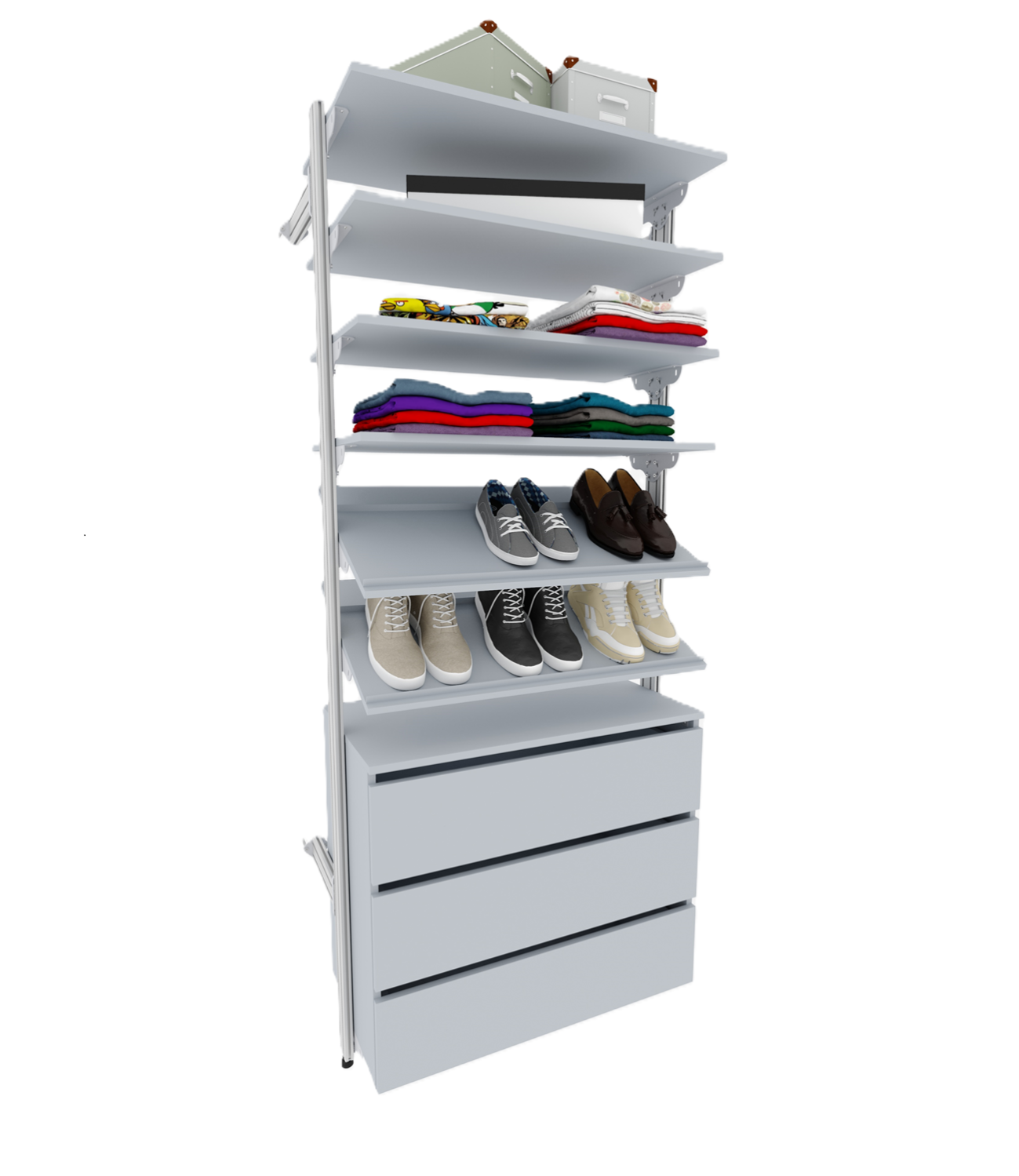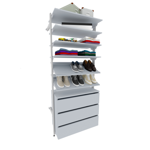 | Комплектация | модуль 1 стойкая базовая уборная система SS (алюминий анодированный + комплектующие) 2 шт., модуль 1.1 накладка на стойкую базовую 2 шт., модуль 2.1(600,800) полка 600,800х450 мм 4 шт., модуль 2.2(600,800) полка для обуви 600,800х450 мм 2 шт. модуль 3.3 (600,800) тумба на 3 ящика 600,800х450х692 мм 1 шт. |