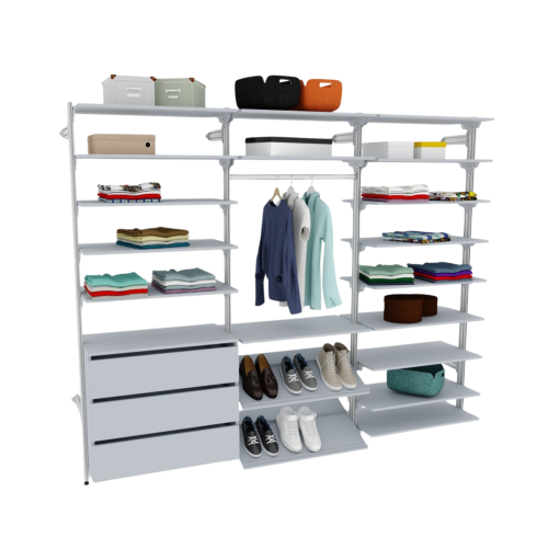 | Комплектация | модуль 1 стойка базовая гардеробной системы SS (алюминий анодированный + комплектующие) 4 шт., модуль 1.1 накладка на стойкую базовую 2 шт., модуль 2.1 (600,800) полка 600,800х450 мм 17 шт. модуль 2.2 (600,800) полка для обуви 600,800х450 мм 2 шт., модуль 3.3 (600,800) тумба на 3 ящика 600,800х450х692 мм 1 шт., модуль 4.1 (600,800) труба на стойку 600,800 мм 1 шт. |