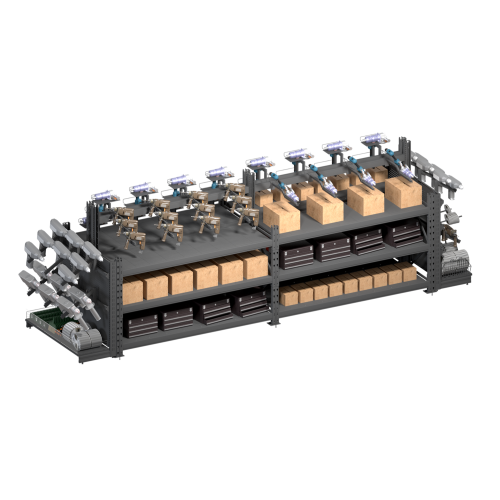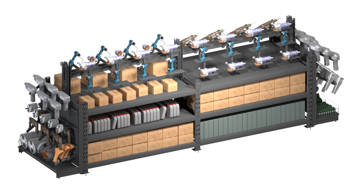 Гондола имеет несколько функциональных ярусов, позволяющих размещать товары разных категорий: на нижних полках — кейсированные инструменты, запасные части, расходные материалы; на среднем – блоки с коробками или демонстрационными образцами, а на верхнем – товар в действующей экспозиции.
