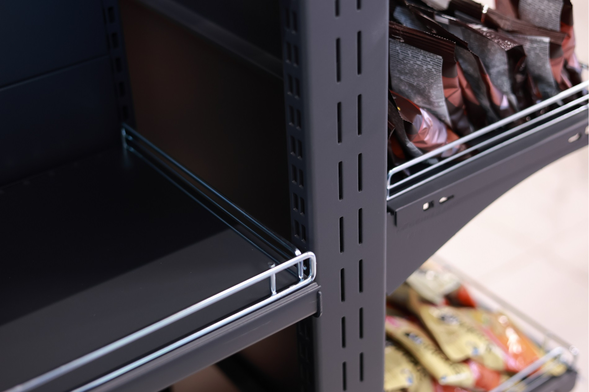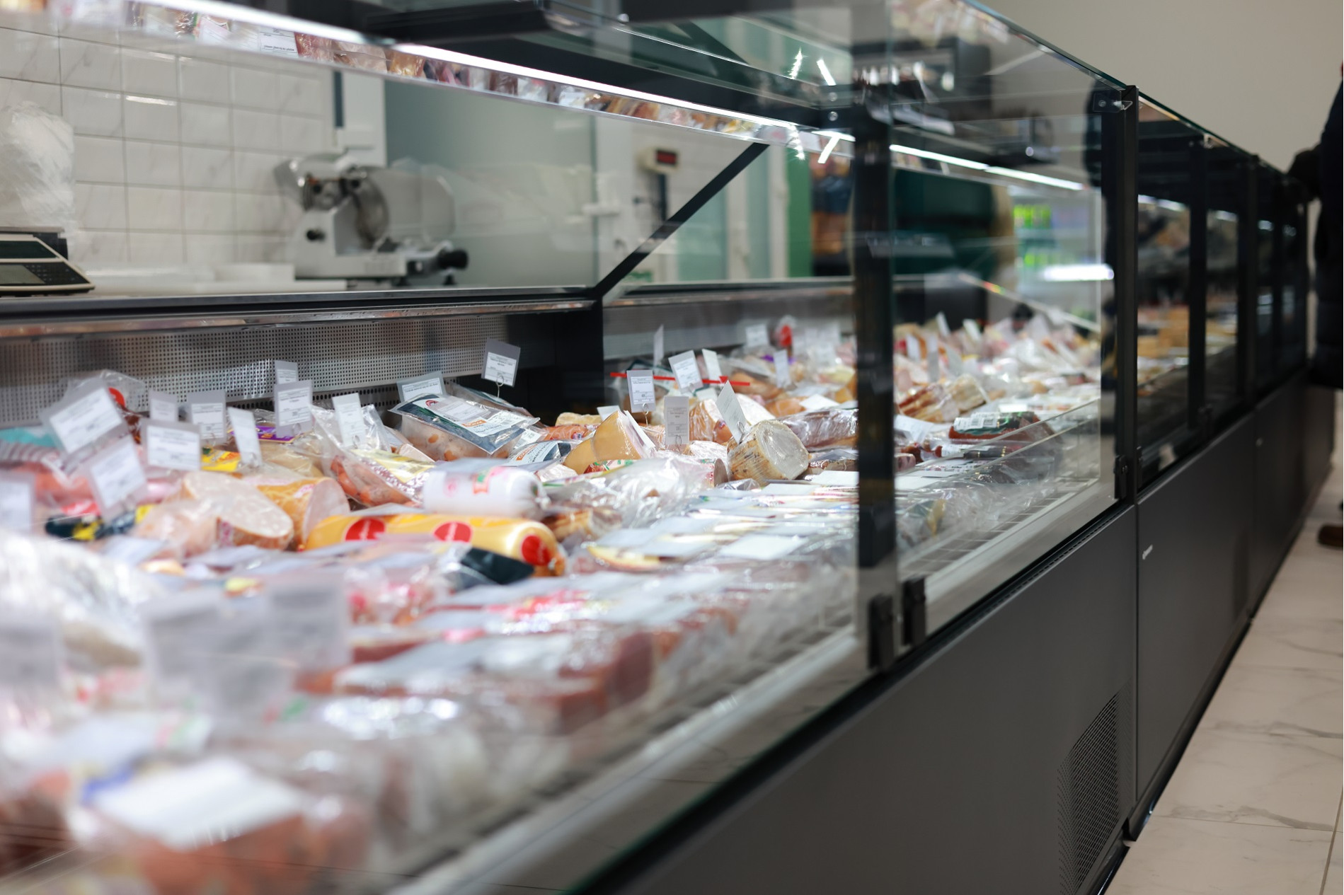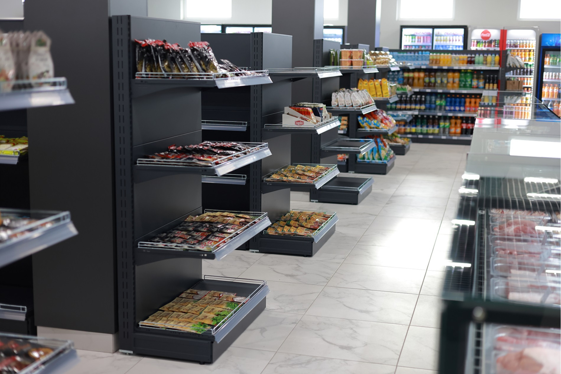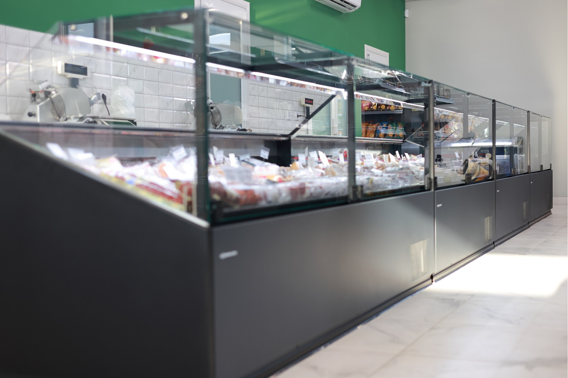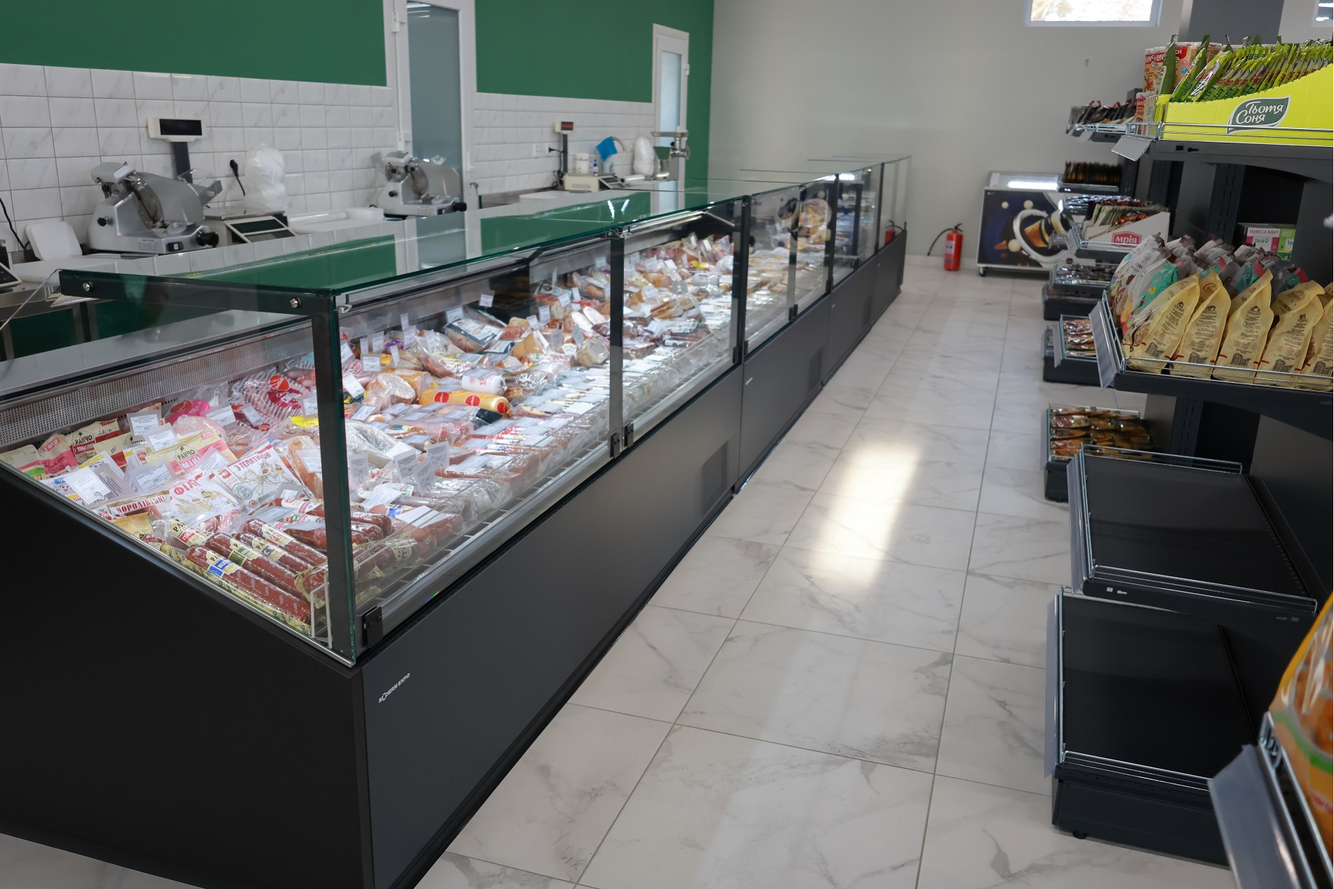 На площади в почти 150 квадратных метров кроме стеллажного оборудования, свое место заняли пристенные холодильные витрины (регалы), ряд гастрономических витрин для мяса, рыбы и молочной продукции, островные стеллажи, стеллажи под алкоголь с усиленными полками и кассовая линия Pulsar сразу на двух кассиров с импульсной зоной дополнительных покупок. Все взвешено, продуманно и комфортно как для клиентов магазина, так и для персонала.