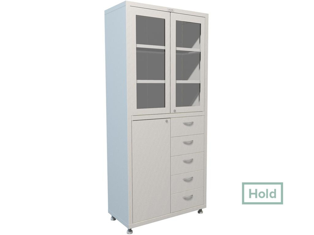 Медицинские шкафы HILFE МД 2 1780 R-5 используются для хранения медикаментов, инструментов, документов и хозяйственного инвентаря в больницах, клиниках, лабораториях и других лечебно-оздоровительных организациях. Шкафы двухстворчатые, внизу секция делится на распашную дверцу и 5 выдвижных ящиков.