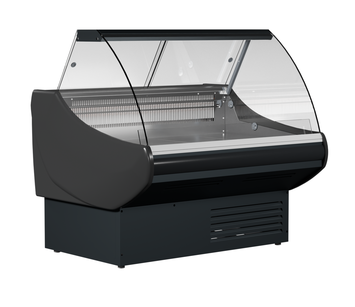 - Фронтальное гнутое стекло — обеспечивает максимальную видимость выкладки, подчеркивает презентабельность продуктов.