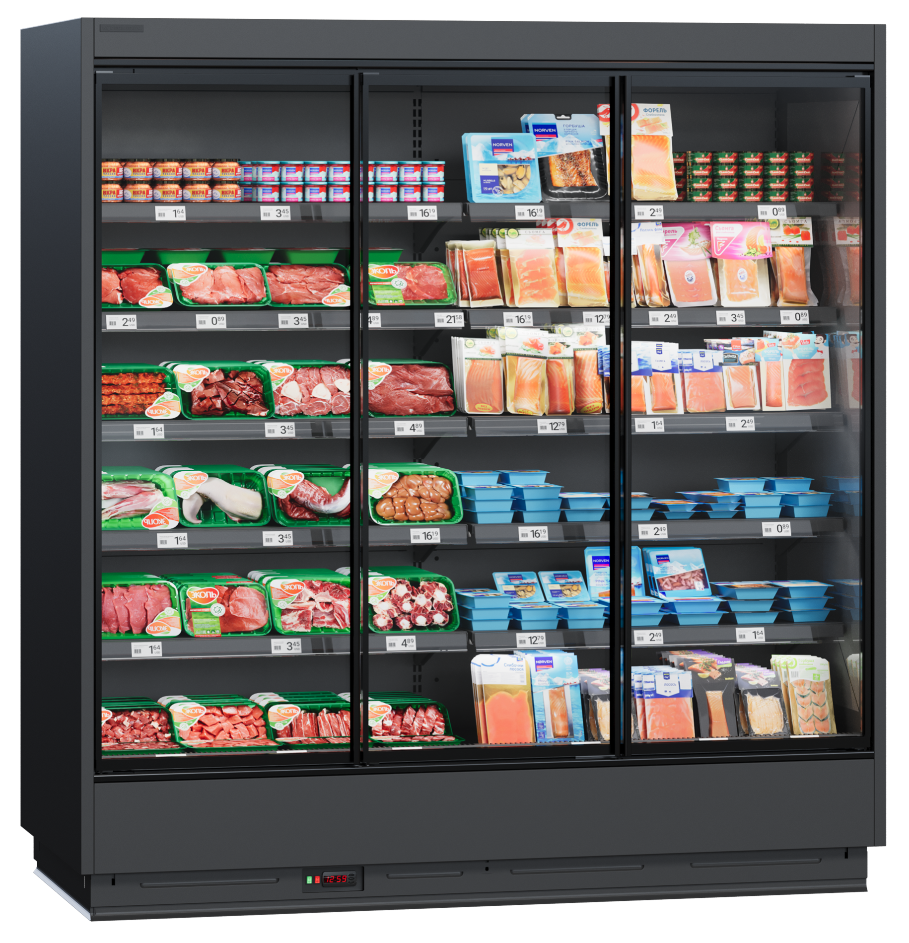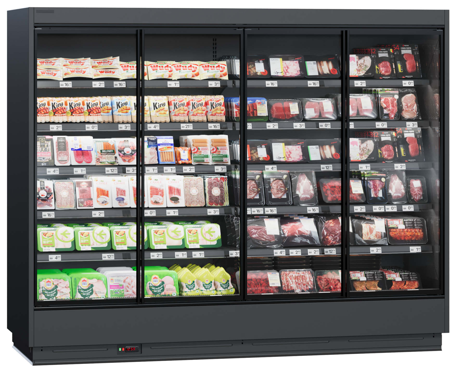 | Дополнительно | декоративная панель, 4 полки, ценник базовой полки, упаковка (поддон) для транспортировки витрины |