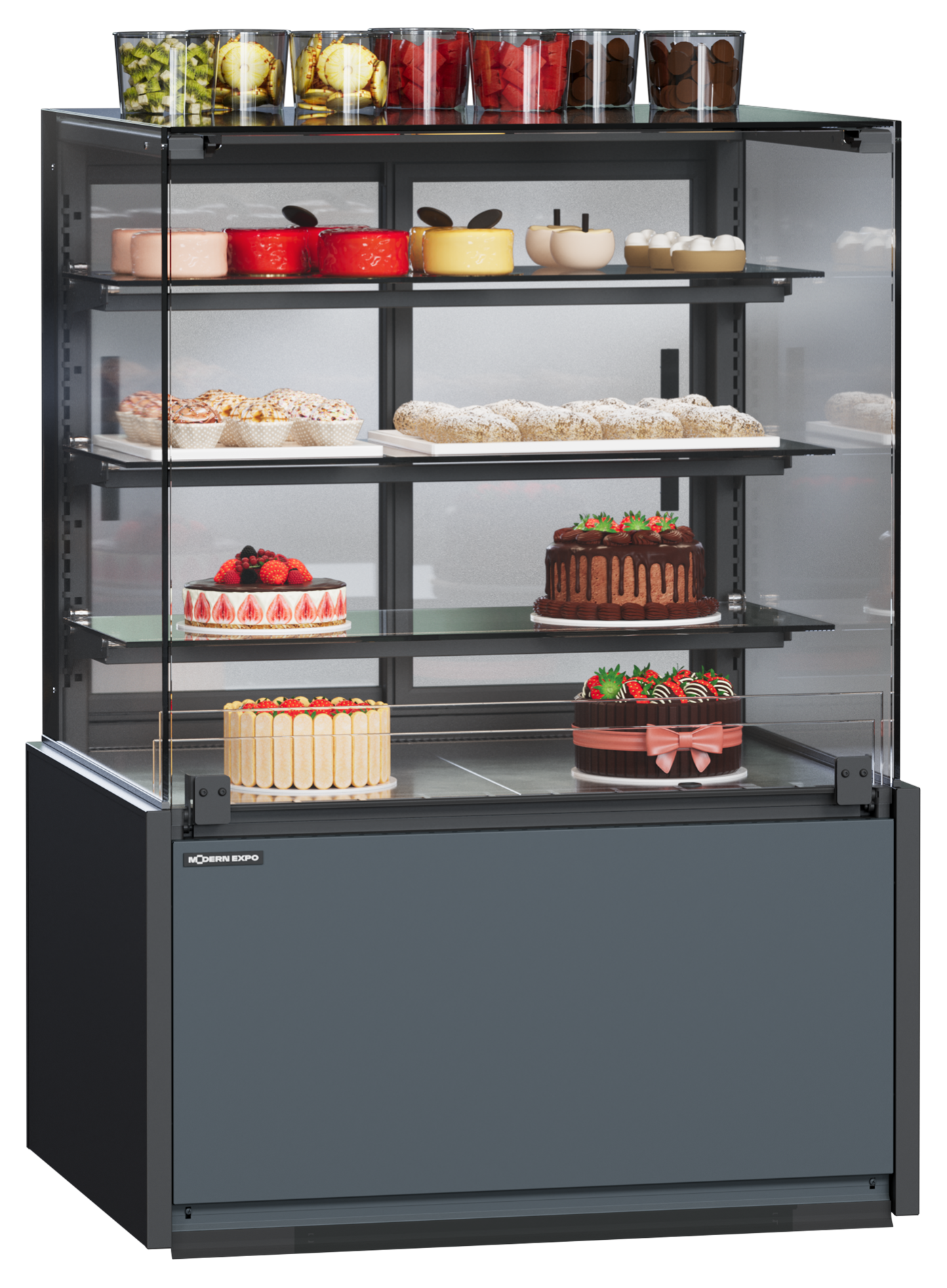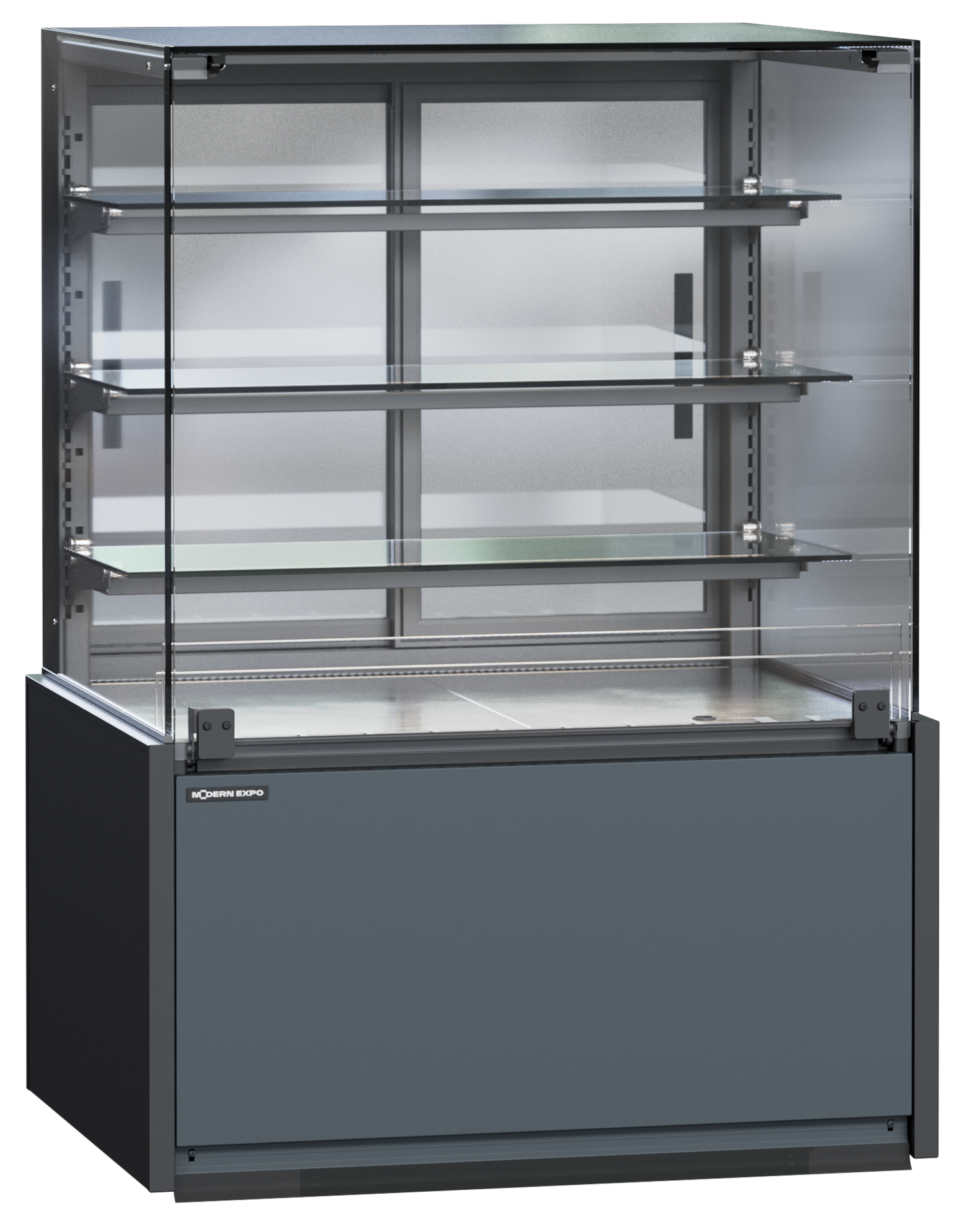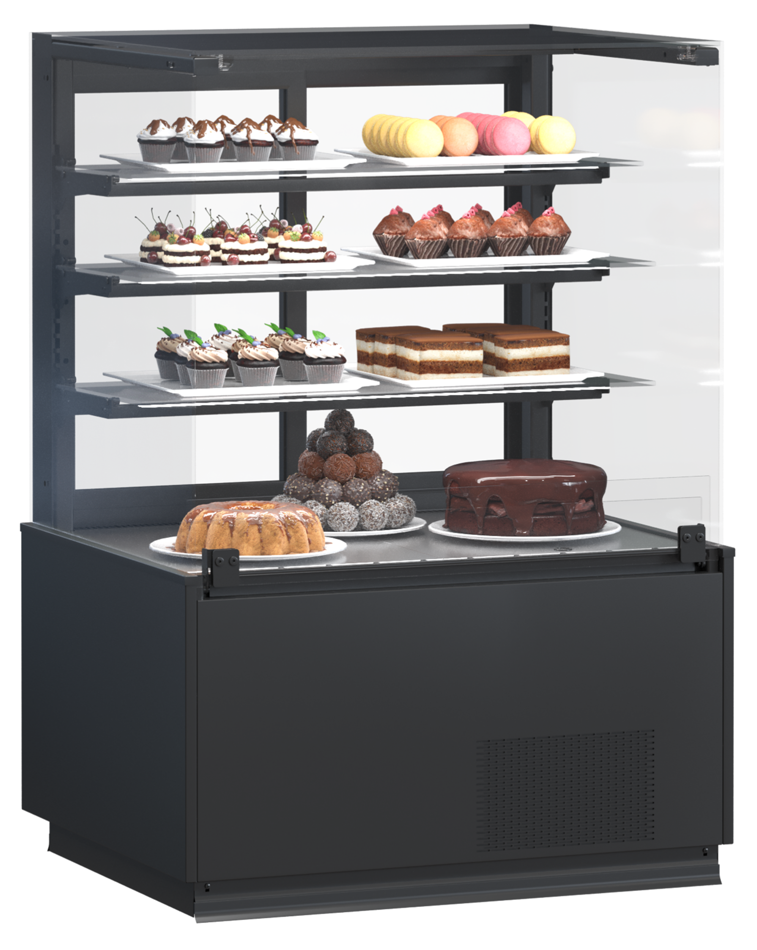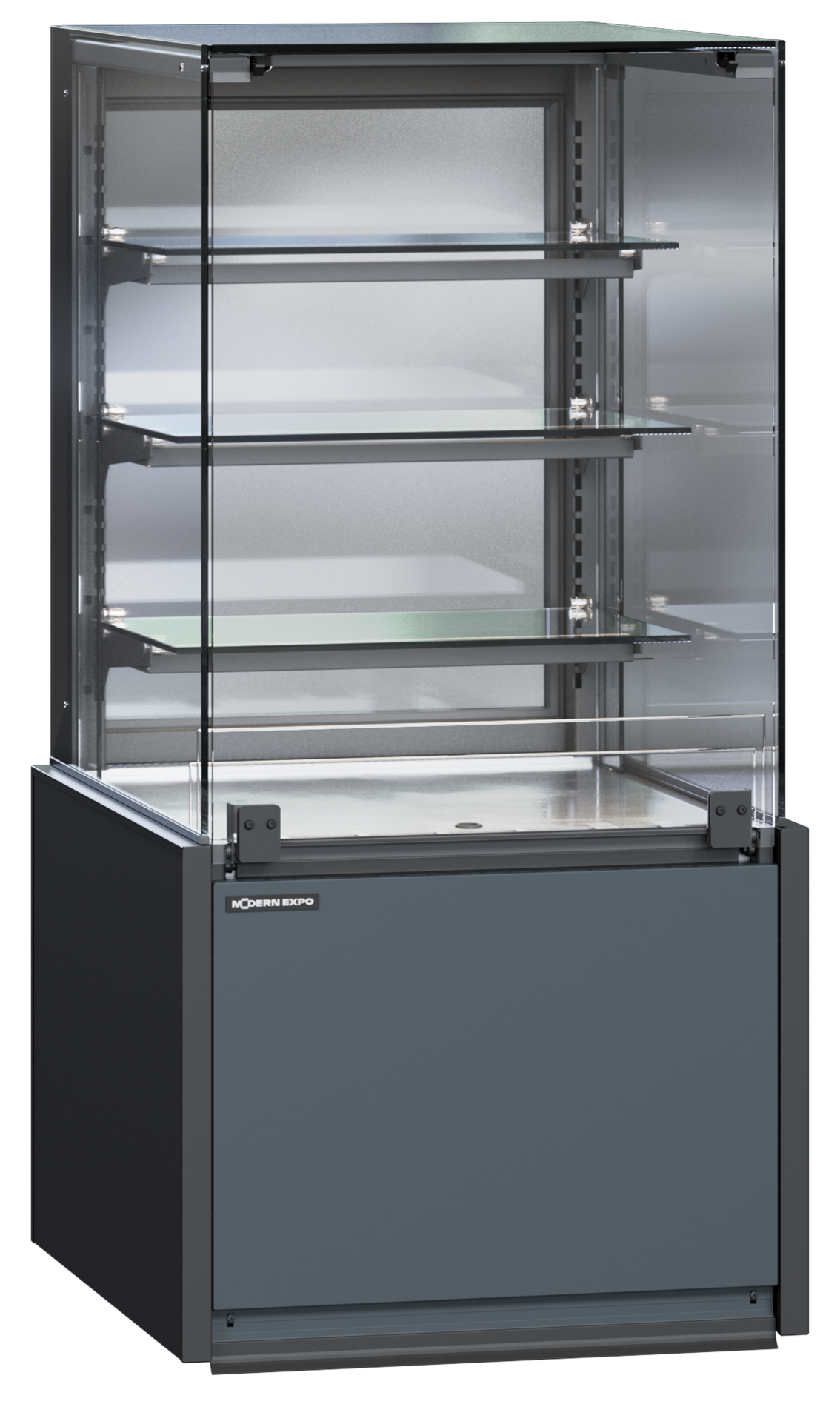 Такая витрина предназначена для хранения продуктов небольшого срока годности, а также товаров без упаковки (продажа на развес). Quadros Slim Confi заполняются максимальным количеством товара с удобным доступом к нему. Витрины комплектуются высоким стеклом и предполагается наличие продавца для выдачи.