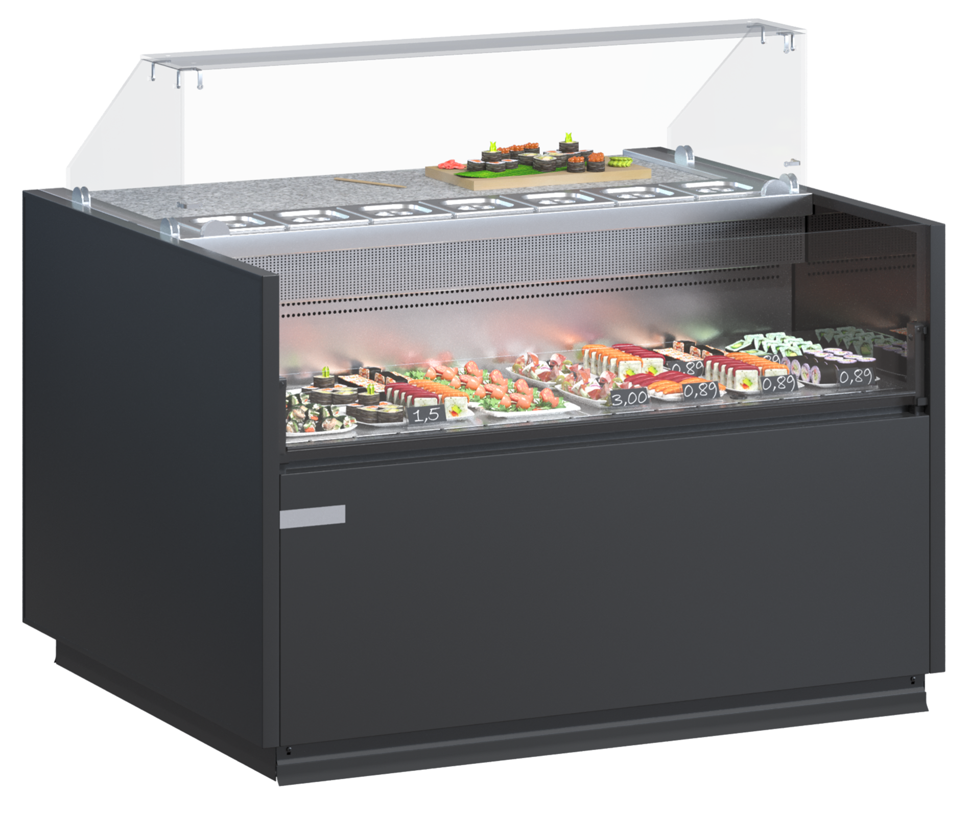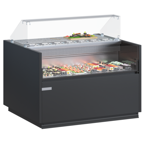 Главной особенностью витрины Quadros Combi есть наличие двух секций. Одна имеет температуру от 0 до + 3 °C, другая – от -18 до -22 °C, поэтому идеально подходит для хранения замороженной продукции.