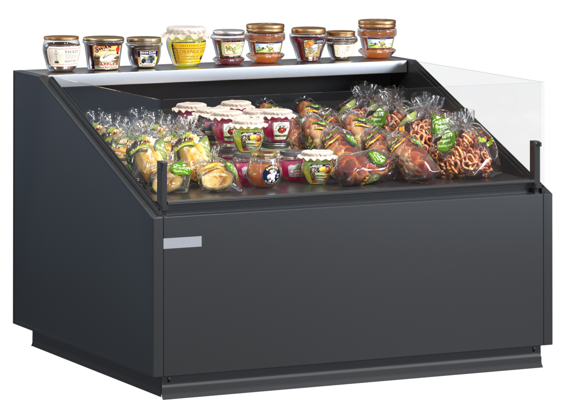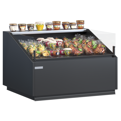 Витрина для самообслуживания отличается от других моделей холодильных витрин отсутствием верхнего стекла, благодаря чему покупатель может без помощи продавца взять необходимый ему продукт. Есть только фронтальное стекло, которое служит барьером для продукции и воздушных потоков. В таких витринах свежесть продуктов, в том числе без упаковки, и их товарный вид поддерживаются системой охлаждения, при которой холод подается снизу.