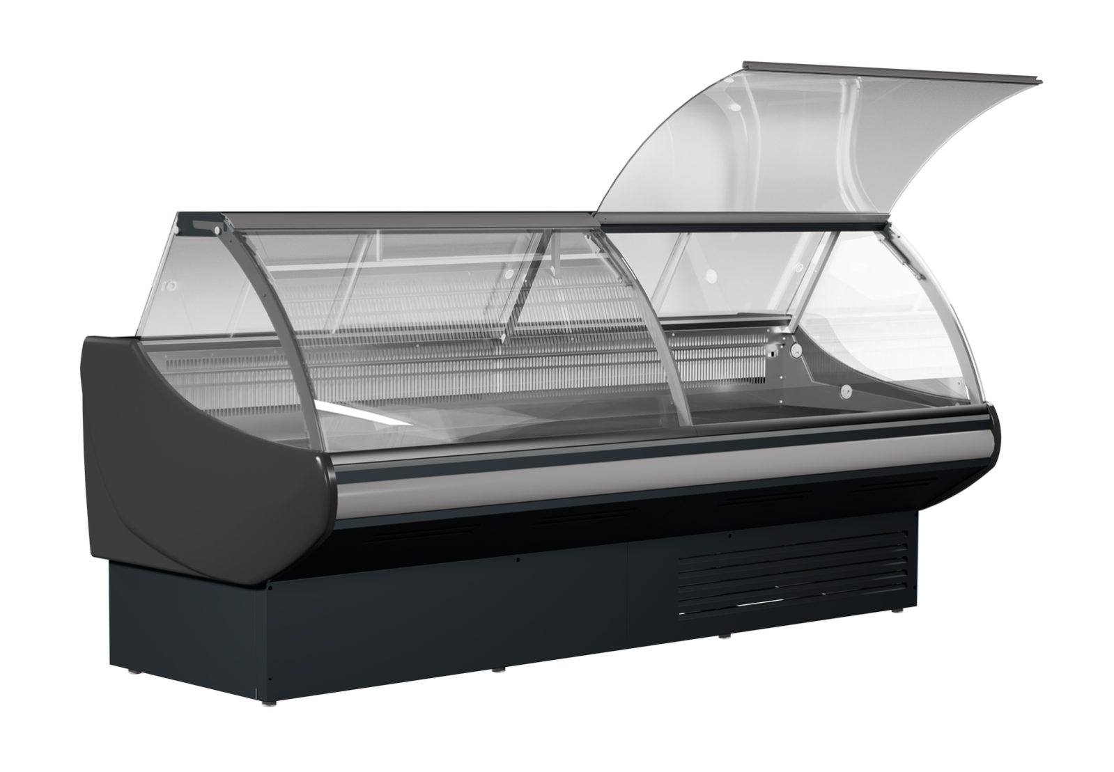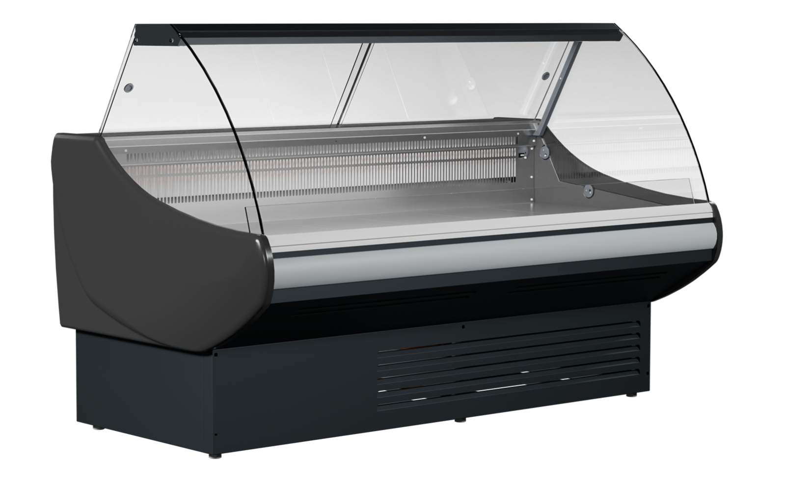 - Фронтальное гнутое стекло — обеспечивает максимальную видимость выкладки, подчеркивает презентабельность продуктов.