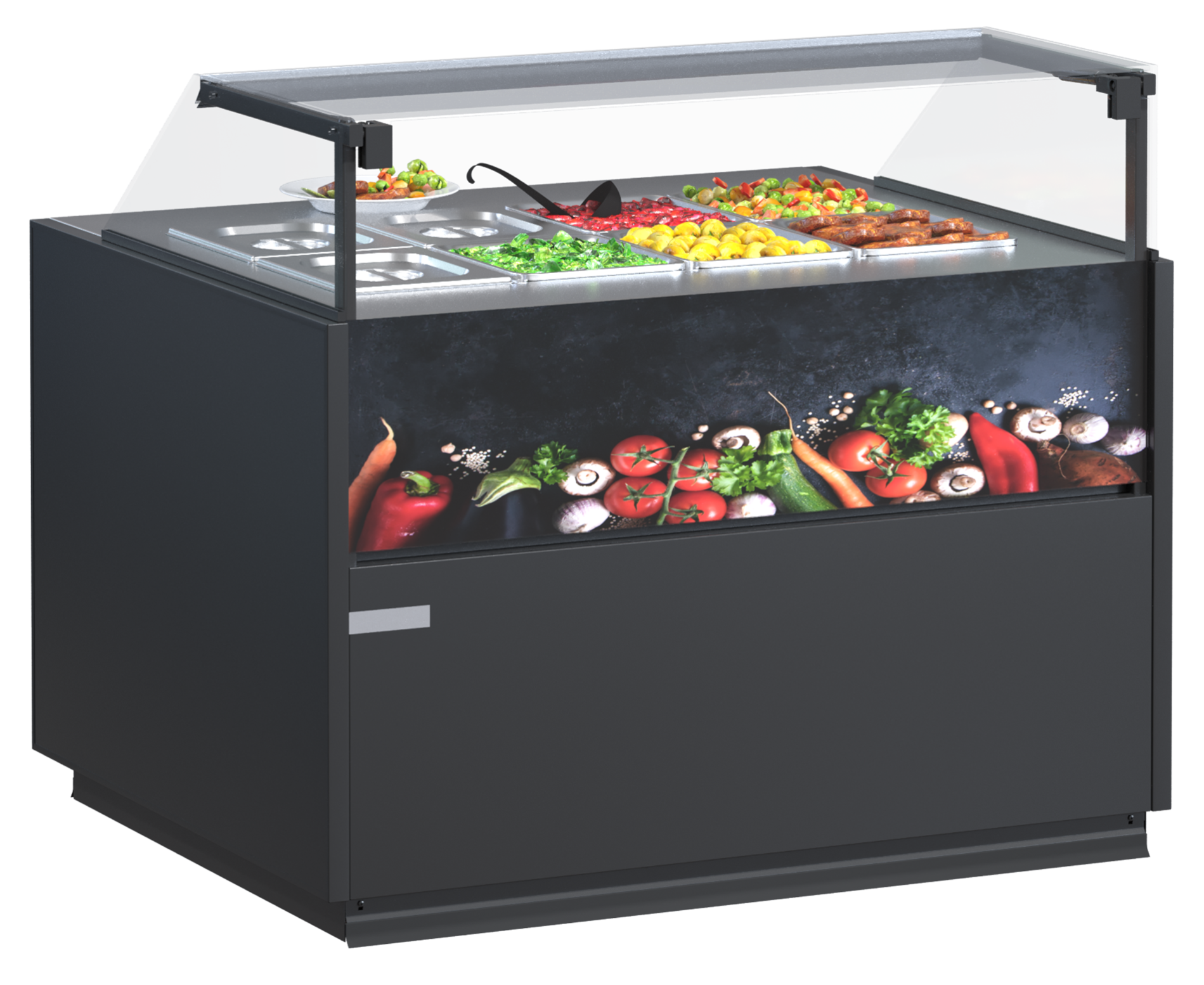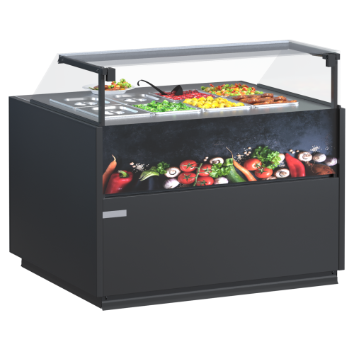 Витрина Quadros Warm — это тип напольной витрины, позволяющей сохранять готовые блюда теплыми на протяжении некоторого времени. Такое оборудование подойдет для продажи продуктов как с помощью персонала, так и в режиме самообслуживания.