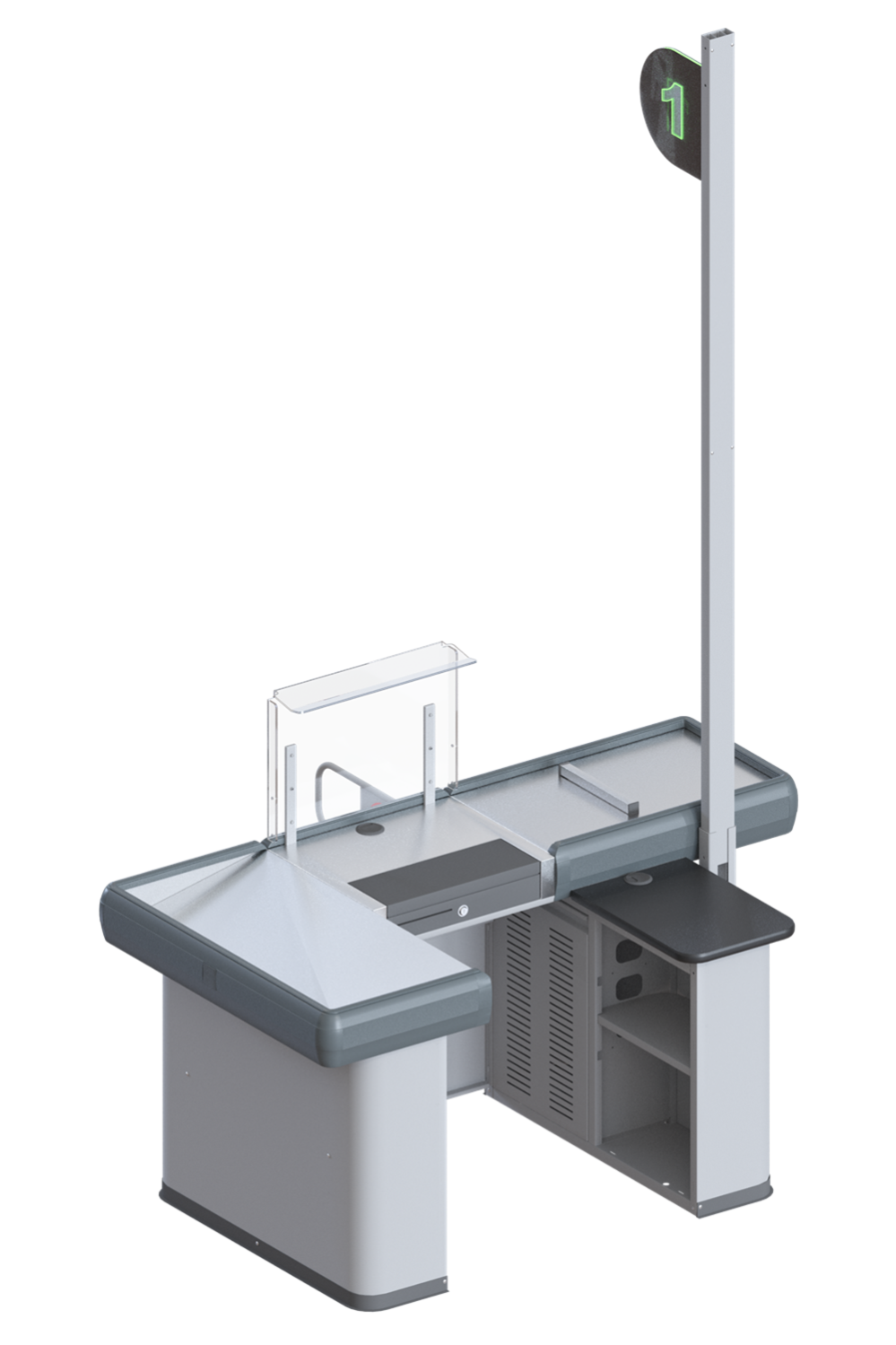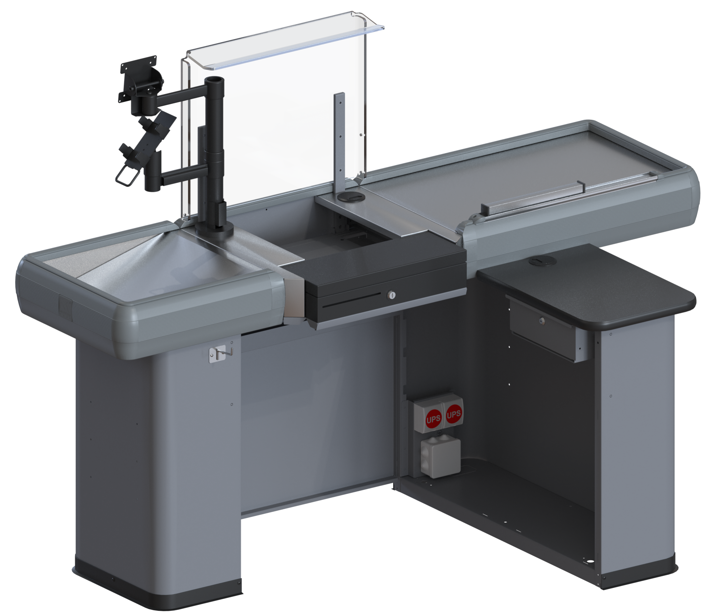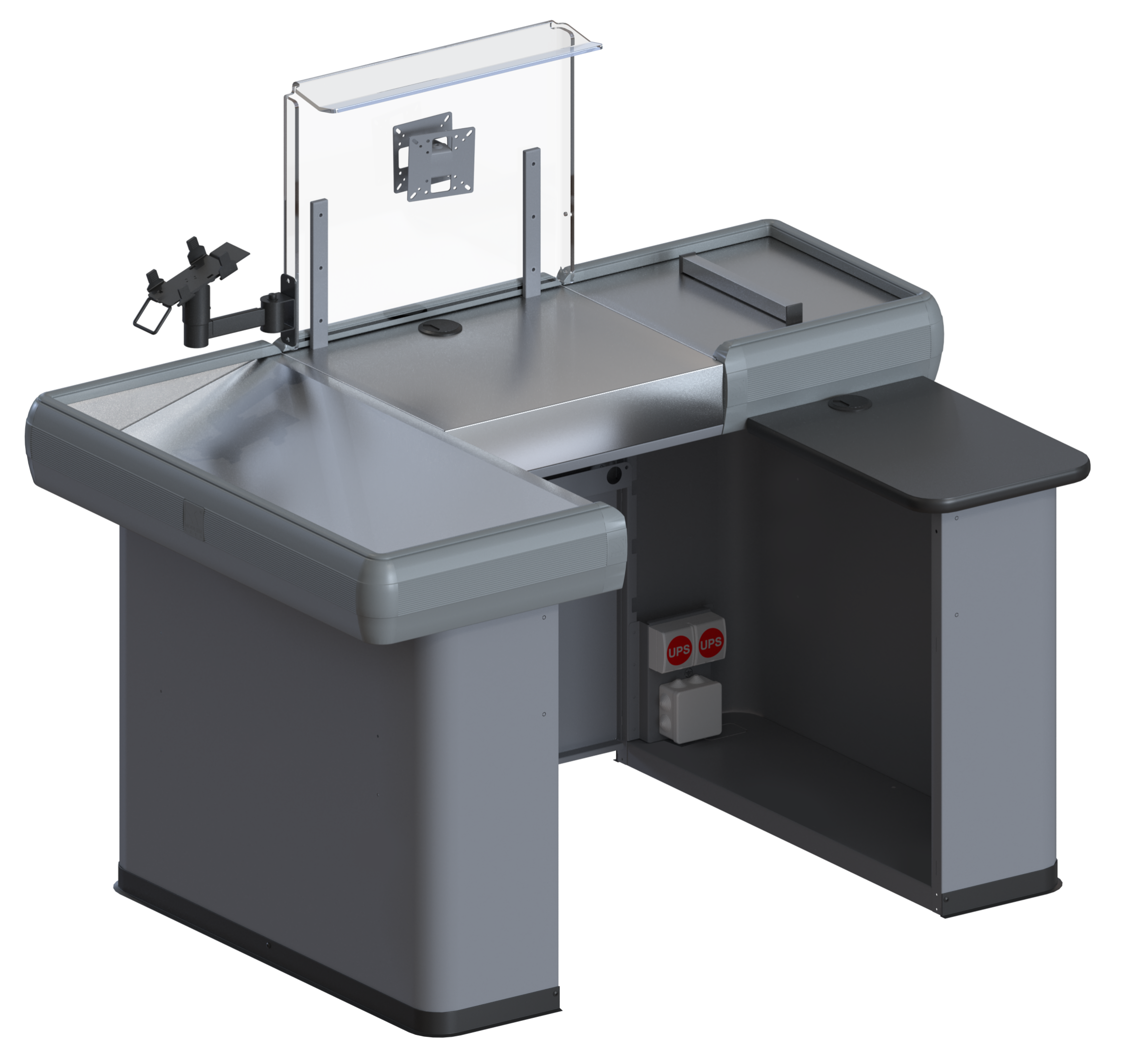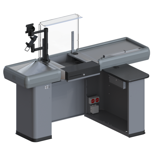 Данные боксы поставляются без конвейерной ленты, в то же время просторен, универсален за счет возможности правостороннего и левостороннего исполнения. Благодаря лаконичному внешнему виду, впишется в дизайн любого торгового помещения, а полимерное порошковое покрытие может быть любого оттенка в соответствии с каталогом RAL и предпочтениям заказчика. Приятным бонусом такого мини кассового бокса есть его низкая стоимость в сравнении с боксами для больших супермаркетов и магазинов.