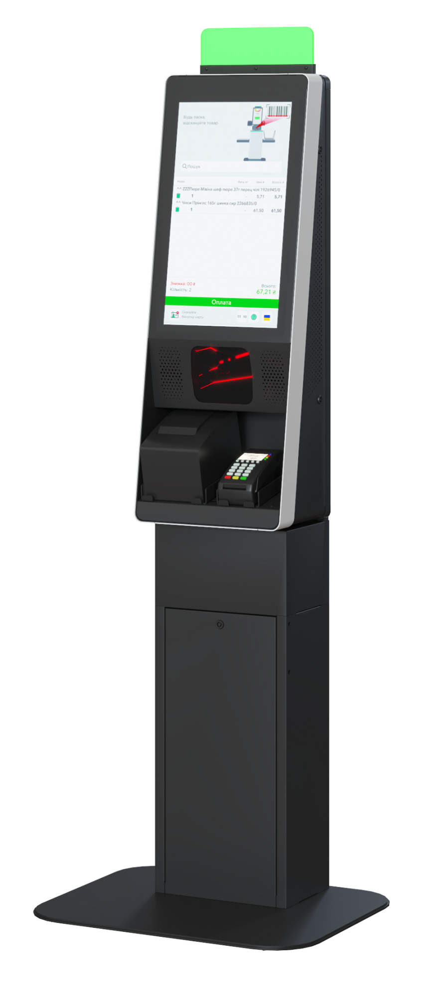 | Комплектующие | касса самообслуживания, дисплей 21", сканер Datalogic Magellan 3450, стойка, полки, держатели принтера и терминала оплаты |