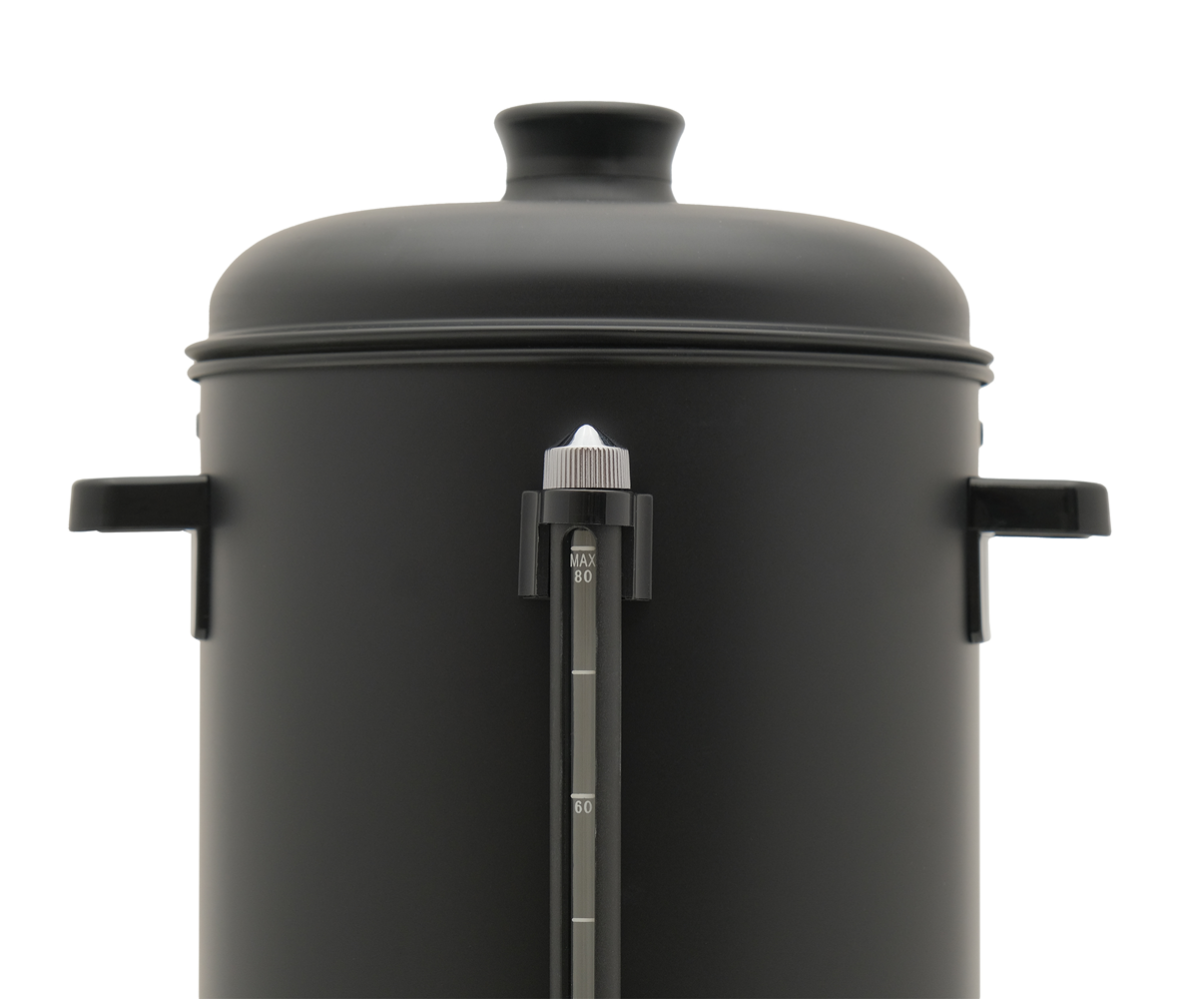 Корпус изготовлен из окрашенной нержавеющей стали, что обеспечивает устойчивость к коррозии, легкий уход и привлекательный внешний вид. Общий объем 10 литров, полезный — 8 литров, чего достаточно для приготовления до 50 чашек горячих напитков. Наполнение водой осуществляется вручную, а индикатор уровня позволяет контролировать остаток в резервуаре.