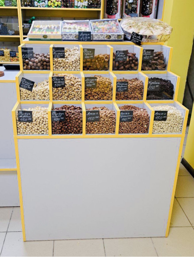 - Высокая функциональность: прилавок подходит не только для кондитерских изделий, но и для других сыпучих товаров, таких как орехи, сухофрукты, бобовые, специи, чай и т. д.