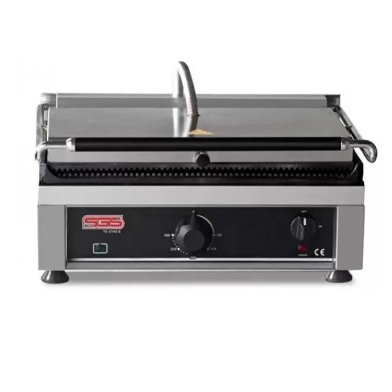 - Корпус контактного (прижимного) гриля SGS 2530 изготовлен из нержавеющей стали, жарочные поверхности – рифленый или гладкий чугун.