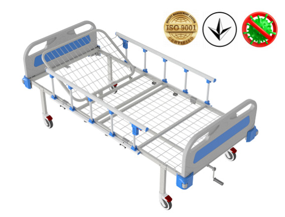 Конструкция медицинской кровати выполнена из стальных труб, окрашенных порошковой краской с антибактериальными свойствами. Предусмотрена возможность бесступенчатого регулирования углов наклона секций основания путём вращения соответствующей ручки. Кровать установлена на колеса диаметром 75 мм. Возможна дополнительная комплектация дугой, перекладиной, эластичным матрасом.