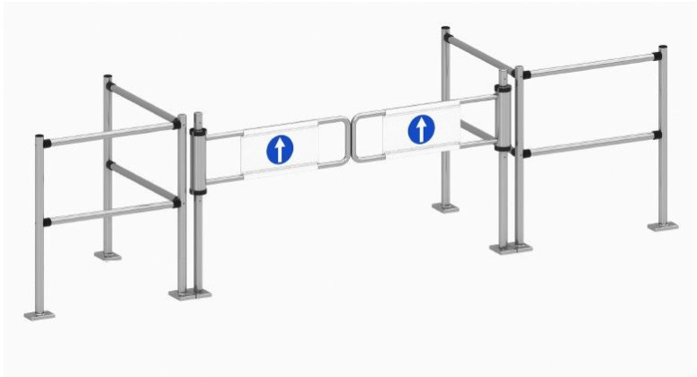Механичесая калитка контролирует покупательский поток, предотвращает столпотворение у входа в магазин. Калитка (турникет) также выполняет охранную функцию: она позволяет проходить внутрь помещения и блокирует выход, а конструкция на пружинах, возвращает открытую створку в первоначальное положение. При необходимости, конструкция предусматривает открытие створки в обратном направлении при усиленном нажатии, таким образом, обеспечивает аварийный выход в случае опасности. Стойки калитки могут быть с различным направлением перемычек. Это позволяет формировать ряды необходимой длинны с поворотами под углом.