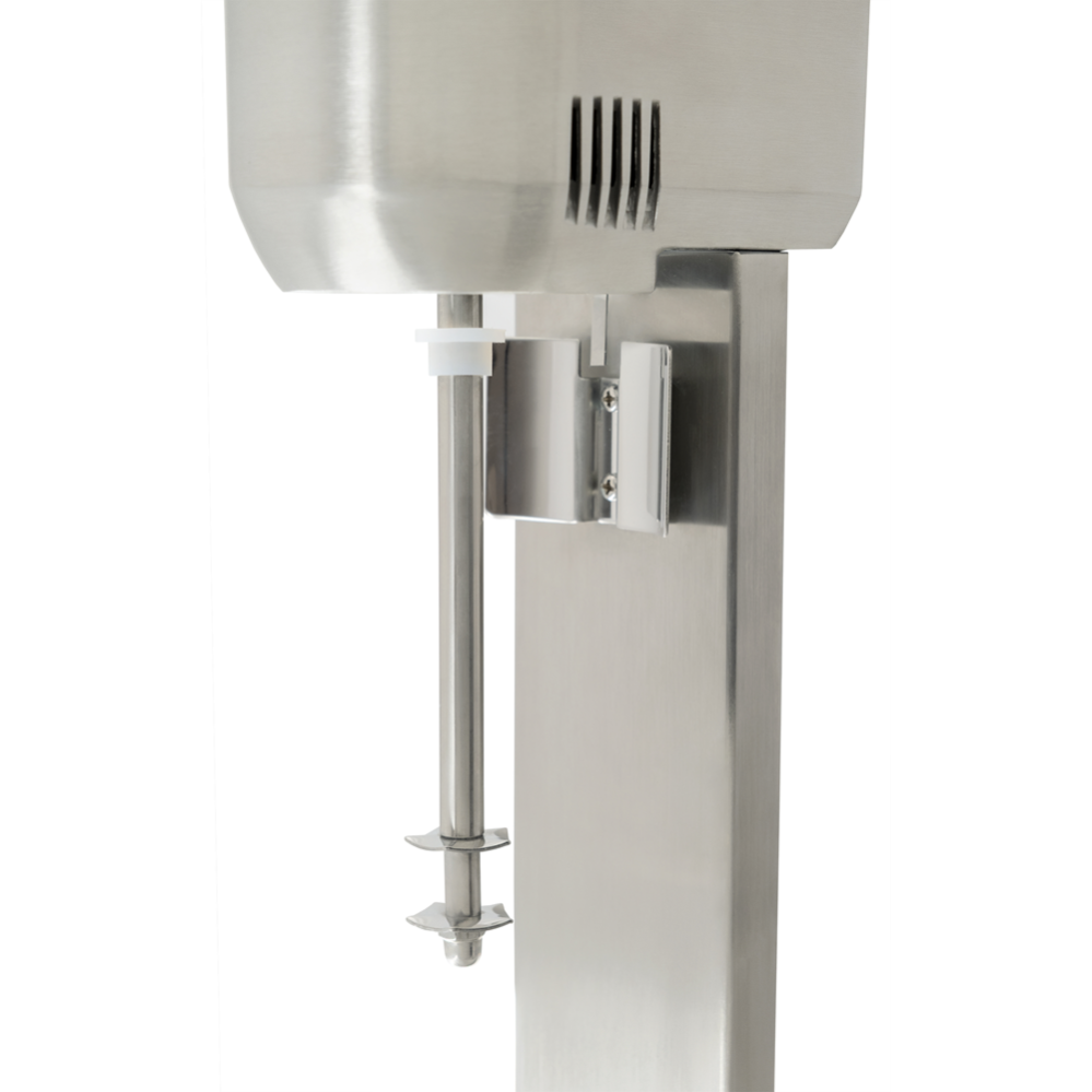 Корпус изготовлен из алюминия, что сочетает легкость конструкции с прочностью. Чаша объемом 1 литр выполнена из нержавеющей стали, как и вал рабочего органа, что гарантирует гигиеничность и долговечность оборудования. Миксер работает на двух скоростях — 8000 и 16000 об/мин — позволяя регулировать интенсивность смешивания в зависимости от типа напитка и желаемой текстуры.