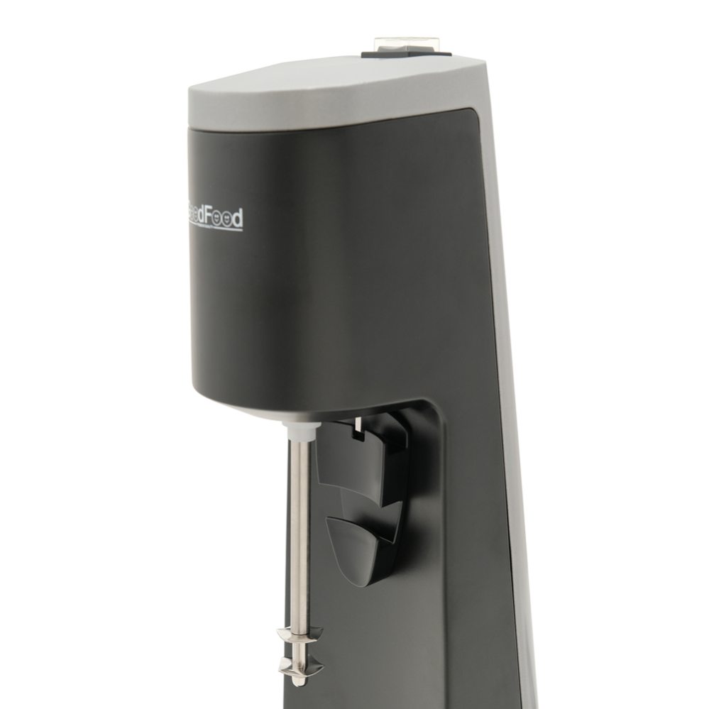 Корпус изготовлен из алюминия, что обеспечивает прочность и длительный срок службы, а чаша объемом 1 л и вал рабочего органа — из нержавеющей стали, что гарантирует гигиеничность и простоту в уходе. Миксер работает на двух скоростях — 8000 и 16000 об/мин, позволяя выбирать оптимальный режим смешивания в зависимости от рецептуры.