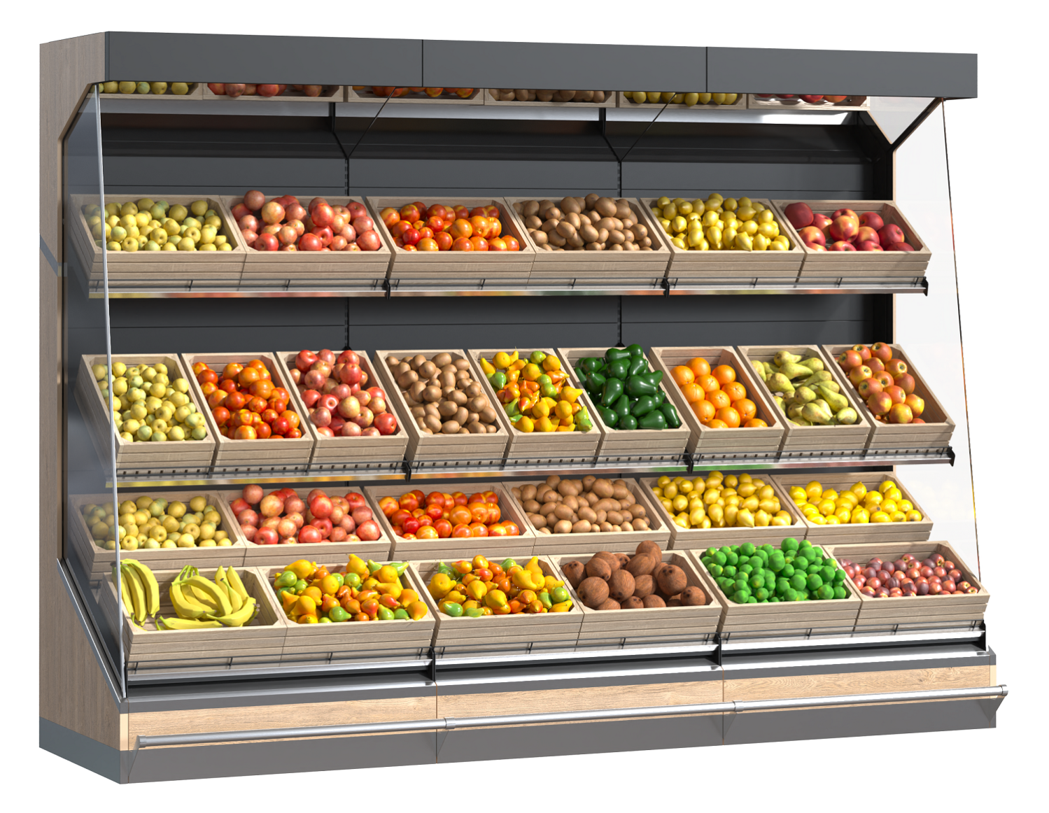 Стеллаж для овощей 2261х3051х973 мм позволяет легко и быстро организовать и разместить овощи. Таким образом покупатели могут легко найти и выбрать продукты. Это также удобно для продавцов, которые могут быстро перекладывать овощи с одного уровня на другой для поддержания свежести.