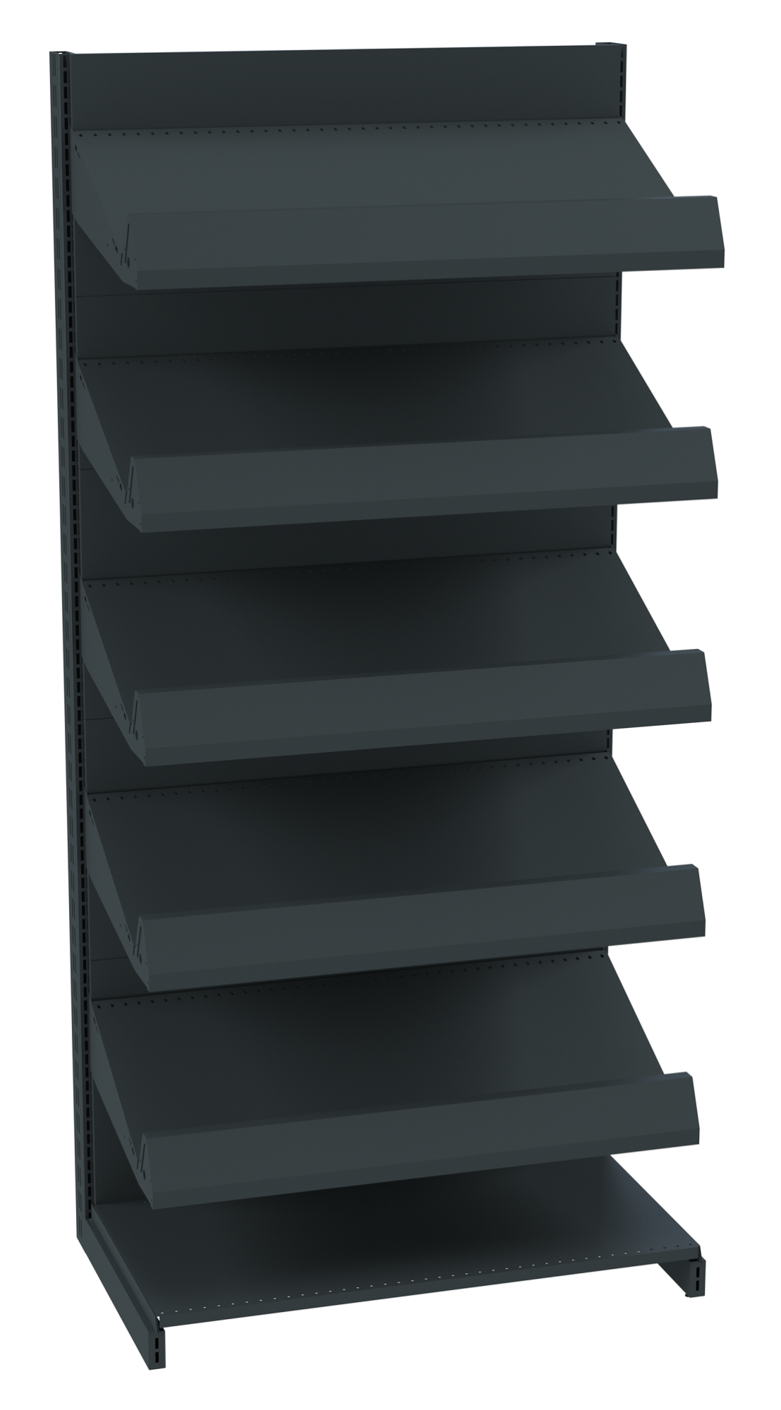 - Подиум (или нижняя полка) – конструкция подиума такая же, как и у других полок. Металлический подиум находится под наклоном и крепится на кронштейны, а не на основание, как у другого оборудования.