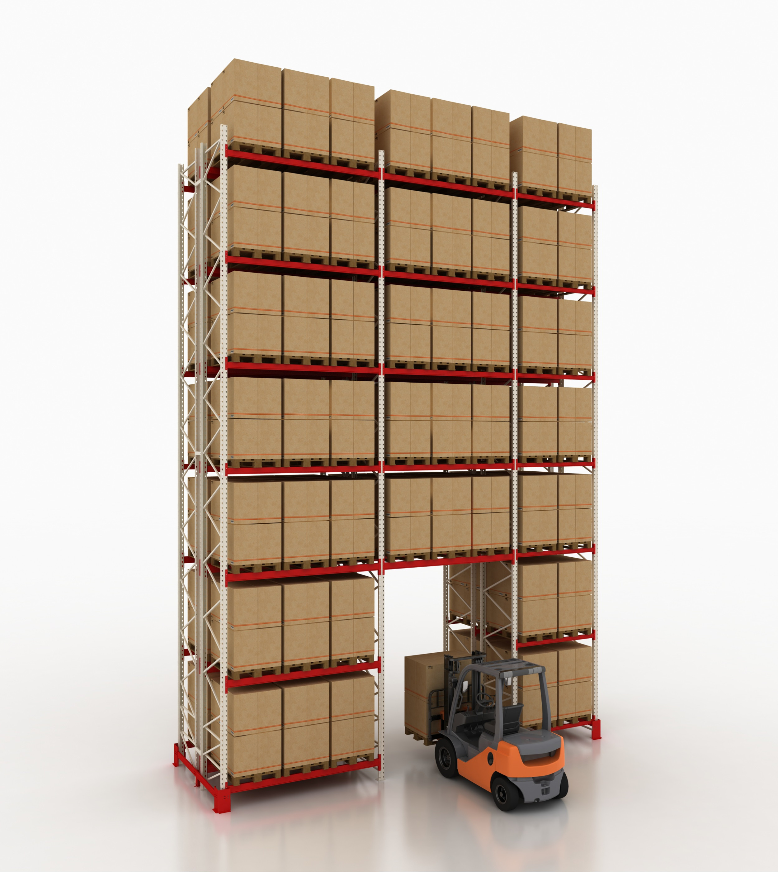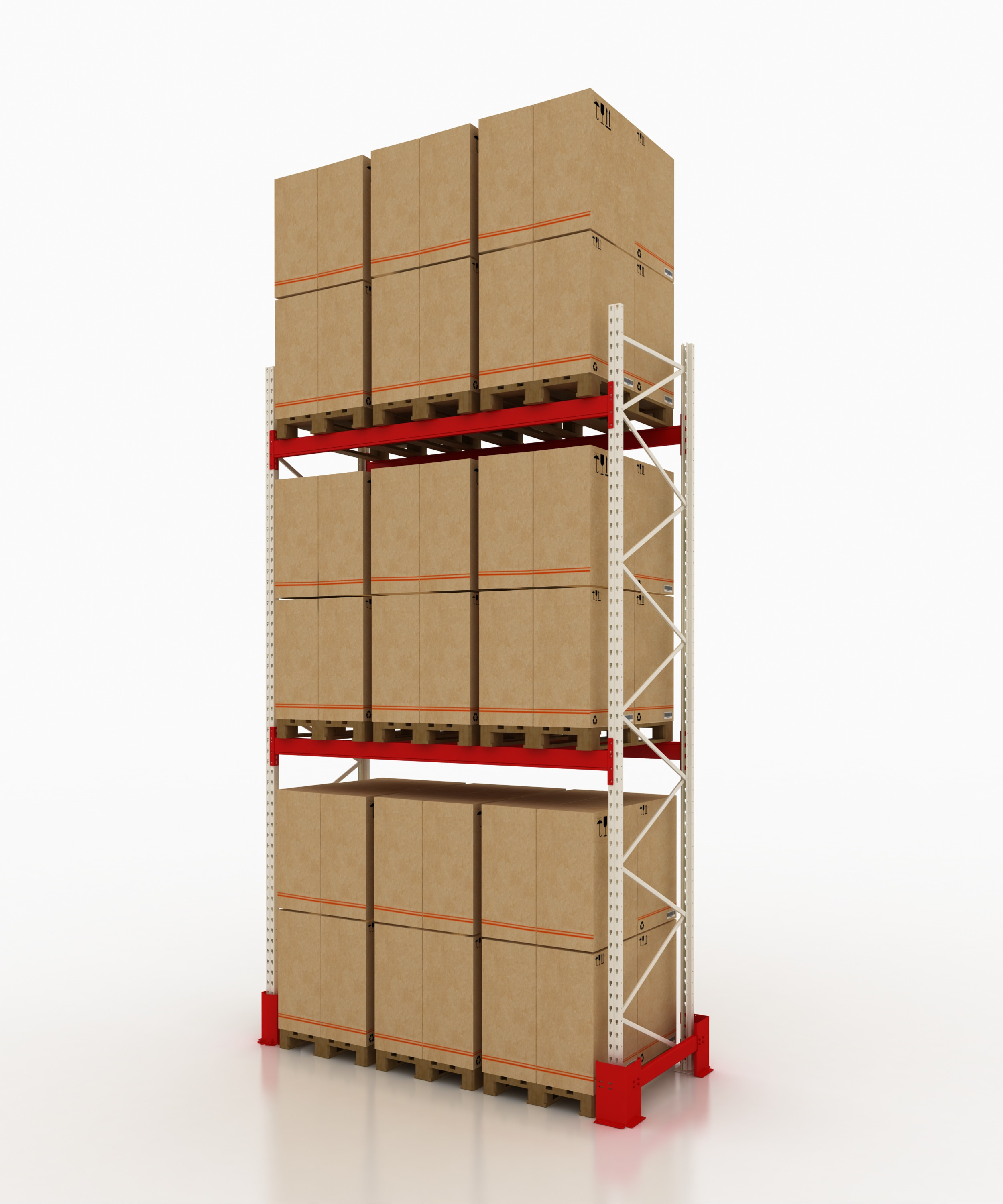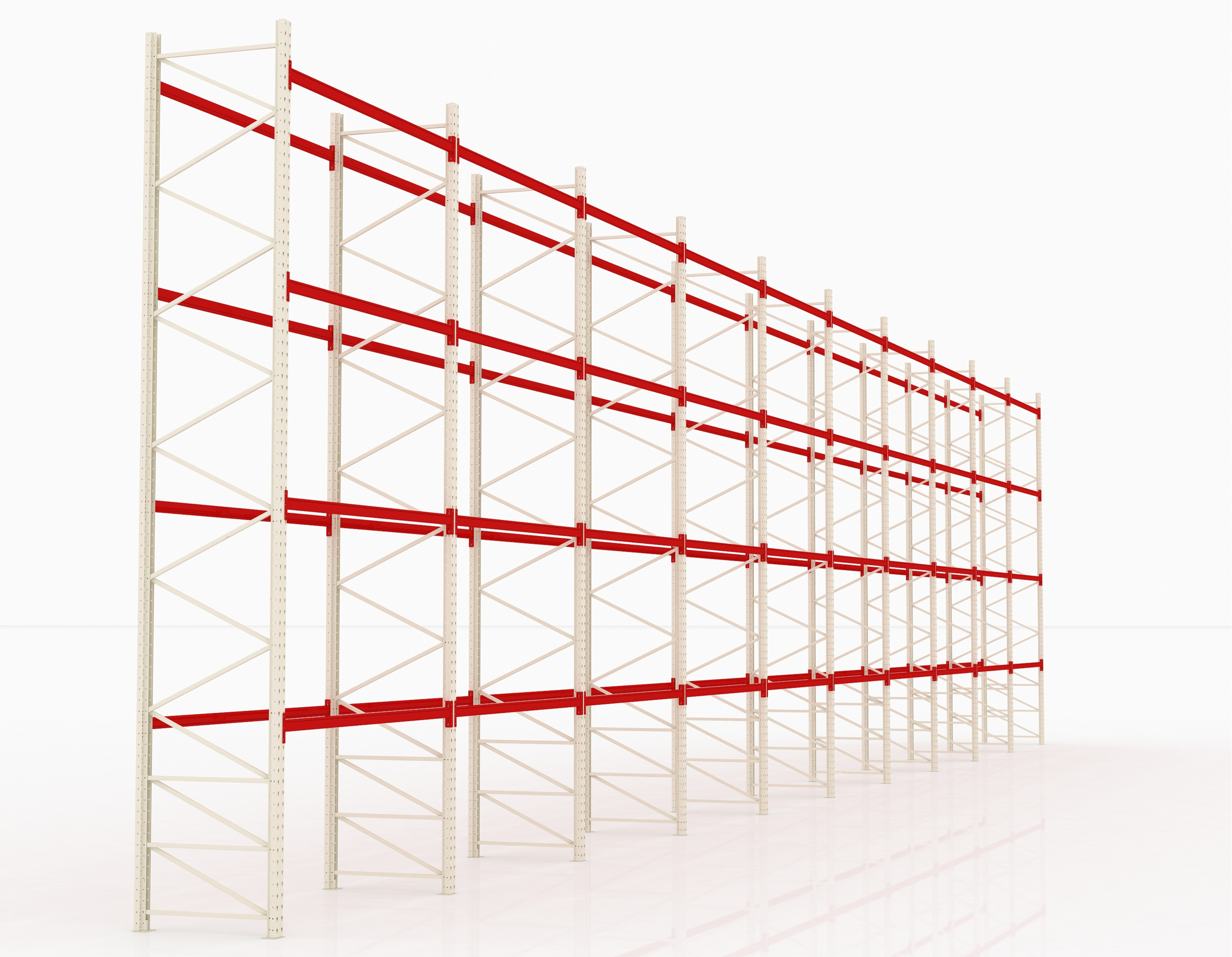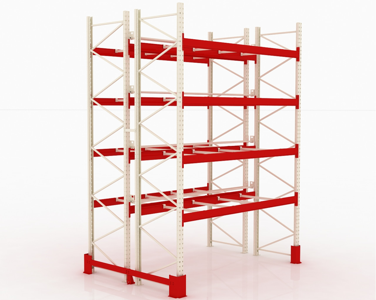 Для рациональной эксплуатации помещения необходимо создание двух и более ярусов для организованного размещения паллет. Фронтальные паллетные стеллажи для склада устанавливаются в несколько рядов. Фронтальный паллетный стеллаж обладает универсальным типом конструкции, которая может использоваться для образования как рядов как одинарных, так и двойных.