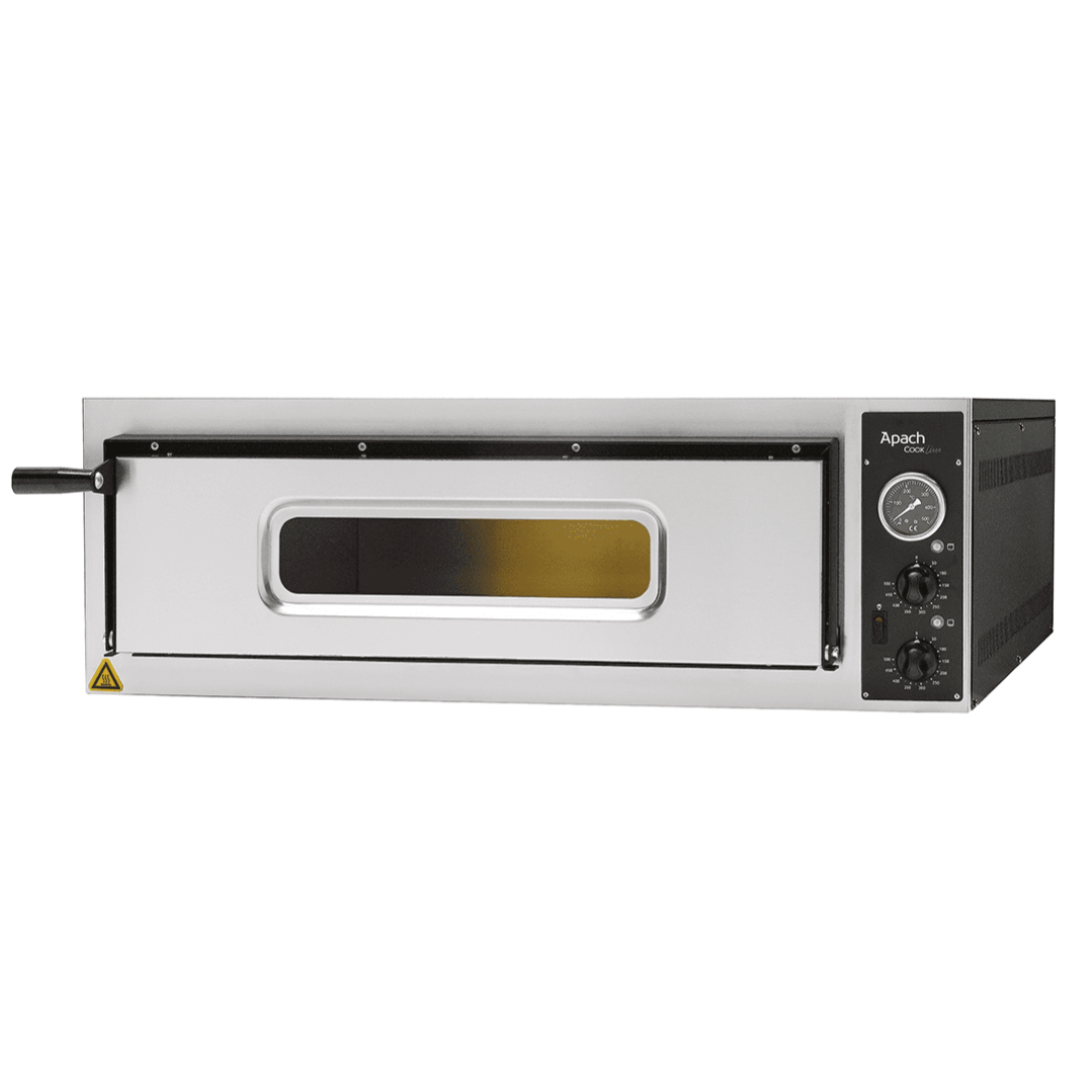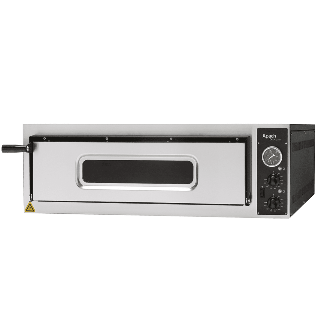 Тесто запекается на гарячих камнях при температуре приблизительно 400 градусов до легкого, хрустящего состояния, температура верхнего жара умеренно доводит до полной готовности начинку. С помощью этого начинка остается сочной и сохраняет в себе все ароматы продуктов. Печи разработаны для професионнального применения на каждый день. Безопасны и надежны, что касается выпечки, просты в эксплуатации, и, что не мало важно, экономны. Модель APACH AMM4X снабжена двумя термостатами и двумя регуляторами интенсивности теплового потока, которые контролируют температуру нагрева как снизу, так и сверху (по 3 ТЭНа снизу и сверху). Внутри есть подсветка камеры которая осуществляется с помощью галогеновой лампы, благодаря чему повар сможет визуально контролировать процесс приготовления пиццы.