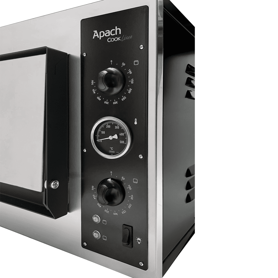 Тесто запекается на гарячих камнях при температуре приблизительно 400 градусов до легкого, хрустящего состояния, температура верхнего жара умеренно доводит до полной готовности начинку. С помощью этого начинка остается сочной и сохраняет в себе все ароматы продуктов. Печи разработаны для професионнального применения на каждый день. Безопасны и надежны, что касается выпечки, просты в эксплуатации, и, что не мало важно, экономны. Модель APACH AML4X снабжена двумя термостатами и двумя регуляторами интенсивности теплового потока, которые контролируют температуру нагрева как снизу, так и сверху (по 3 ТЭНа снизу и сверху). Внутри есть подсветка камеры которая осуществляется с помощью галогеновой лампы, благодаря чему повар сможет визуально контролировать процесс приготовления пиццы.