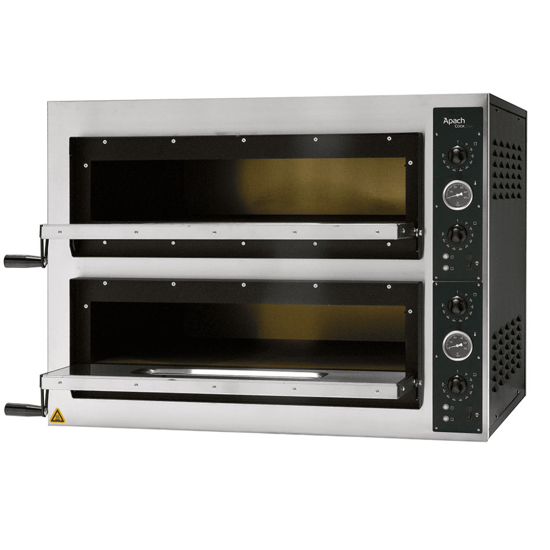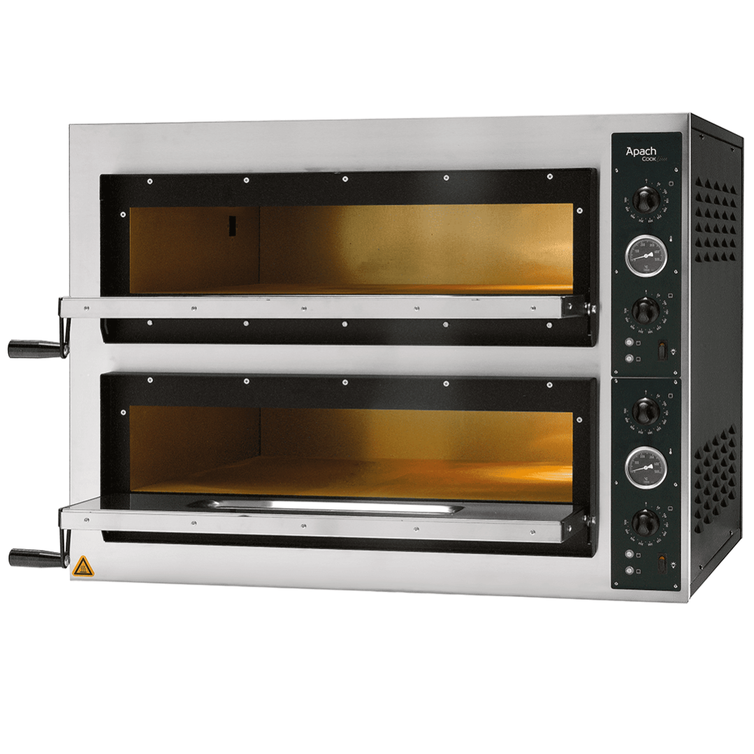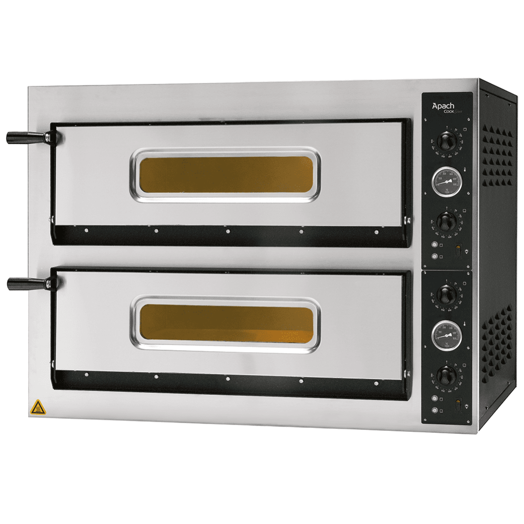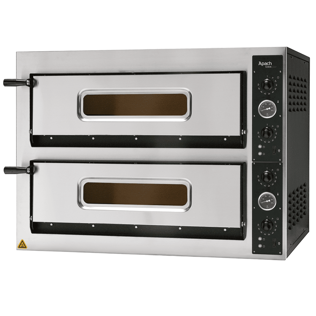 Тесто запекается на гарячих камнях при температуре приблизительно 400 градусов до легкого, хрустящего состояния, температура верхнего жара умеренно доводит до полной готовности начинку. С помощью этого начинка остается сочной и сохраняет в себе все ароматы продуктов. Печи разработаны для професионнального применения на каждый день. Безопасны и надежны, что касается выпечки, просты в эксплуатации, и, что не мало важно, экономны. Модель APACH AML44X снабжена двумя термостатами и двумя регуляторами интенсивности теплового потока, которые контролируют температуру нагрева как снизу, так и сверху (по 3 ТЭНа снизу и сверху). Внутри есть подсветка камеры которая осуществляется с помощью галогеновой лампы, благодаря чему повар сможет визуально контролировать процесс приготовления пиццы.