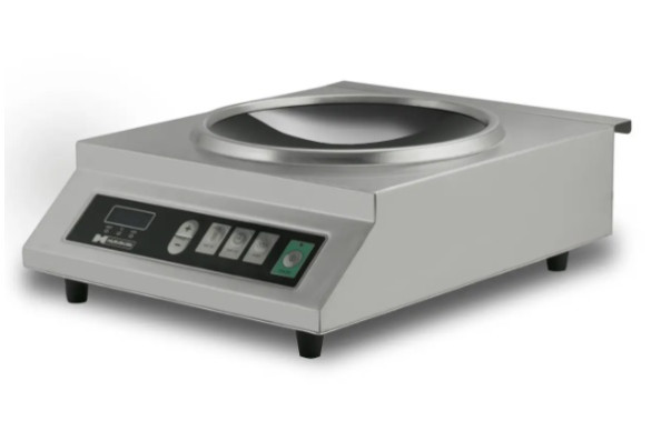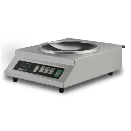 Плита индукционная Hurakan HKN-ICW35M wok предназначена для заведений общепита, в меню которых есть блюда азиатской кухни. Может использоваться для обслуживания выездных церемоний, кулинарных мастер-классов. Корпус сделан из нержавеющей стали, сверху имеется дополнительное защитное покрытие. Отличительная особенность этой модели – конфорка вогнутой формы, которая идеально подходит для специальной сковороды вок. Управление режимами осуществляется посредством кнопок, также на панели имеется таймер с отсрочкой от 1 мин. до 2 ч. Доступные режимы – 0,4-3,5 кВт. При перегреве автоматически отключается.