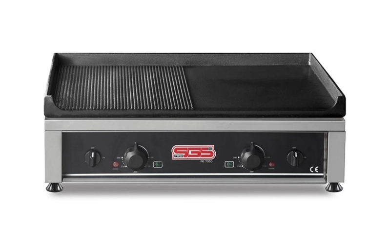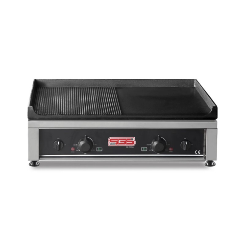 - Жарочная поверхность SGS PG 7050 E изготовлена из качественной нержавеющей стали. Поверхность - из чугуна (легко чистится нагар) с двумя независимыми зонами нагрева гладкой и рифленой.