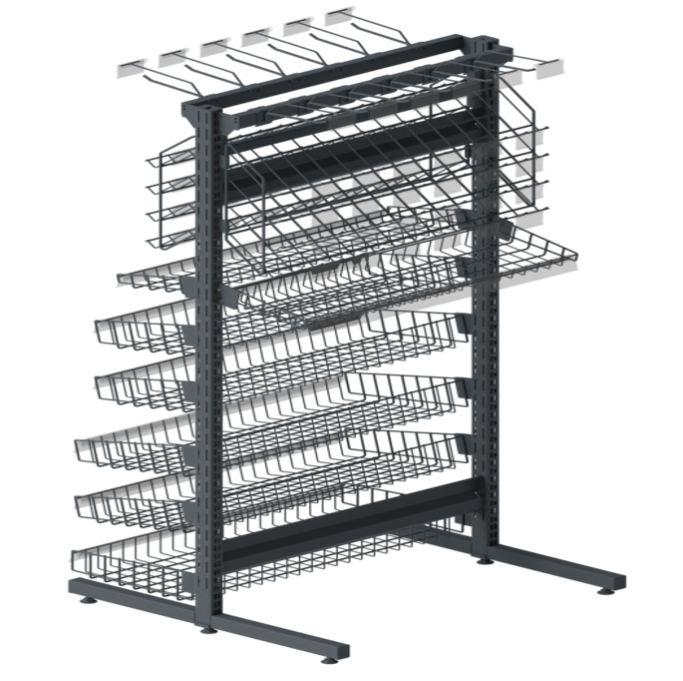 Такие стеллажи обычно устанавливаются у кассовых зон или при выходе из магазина и могут иметь полки и демонстрационные площади с обеих сторон для размещения товаров.