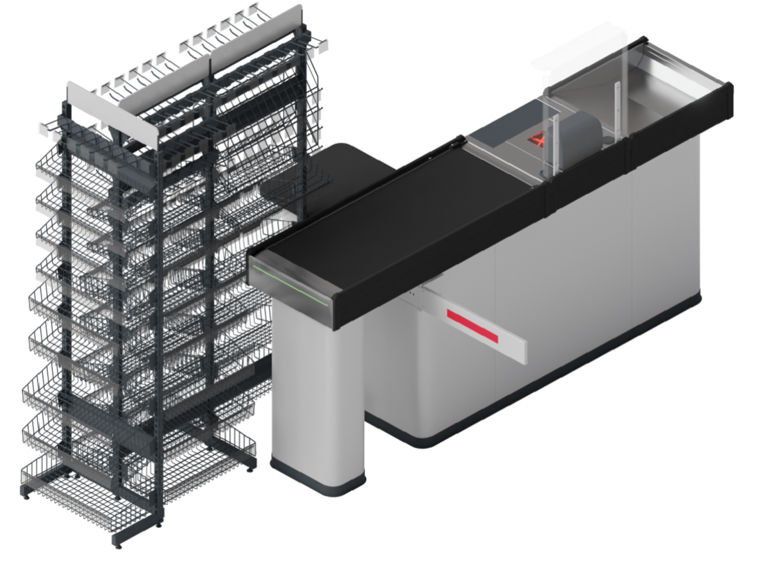 Двухсторонний прикассовый стеллаж для транспортера может использоваться для оптимизации показа и продажи товаров, когда покупатели проходят через транспортер для оформления покупки. Он может служить для выкладывания различных товаров, таких как товары, подходящие для импульсивных покупок, сувениры, сладости, мелкие товары и акционные предложения, чтобы привлечь внимание покупателей перед покиданием магазина. Эти стеллажи также могут иметь место для размещения корзин или тележек для удобства покупателей.