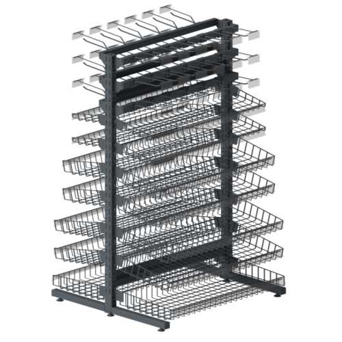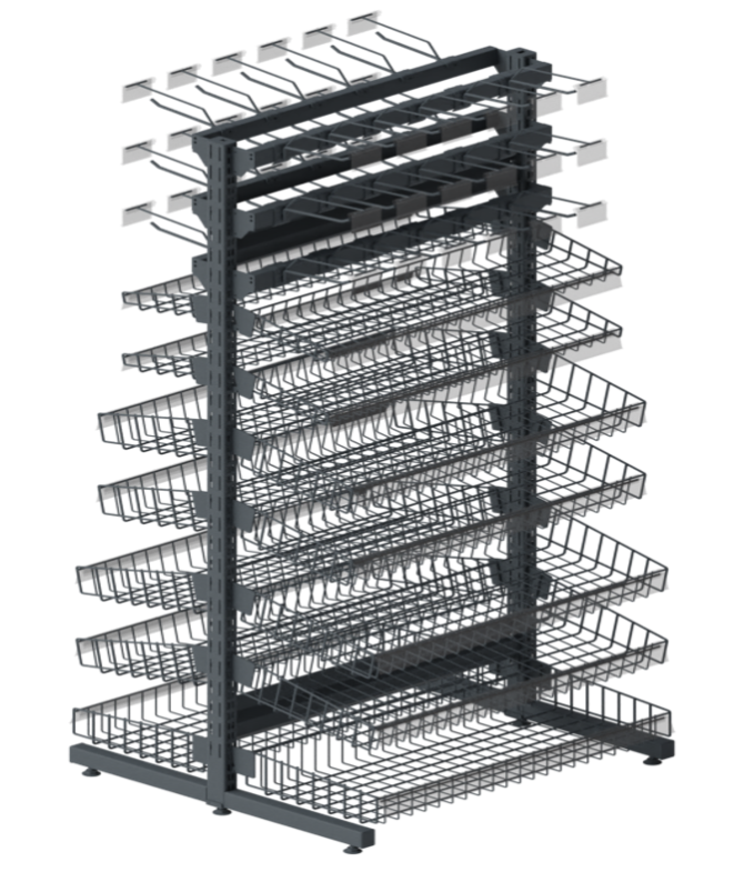 Двухсторонние прикассовые стеллажи обычно размещаются в промежутке между двумя кассами в розничных магазинах или в других стратегических местах, где покупатели часто находятся перед завершением покупки. Они могут использоваться для демонстрации товаров, которые могут стимулировать дополнительные покупки или привлечь внимание к акционным предложениям и новым продуктам.