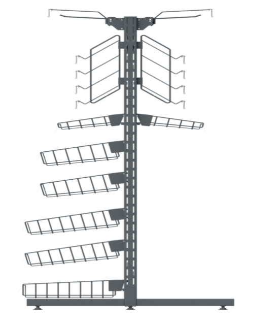 | Комплектующие | корзина малая (200х65х665 мм) - 4 шт, корзина средняя (250х105х665 мм) - 4 шт, корзина большая(300х105х665 мм)- 6 шт, крючки одинарные с ценникодержателем - 36 шт, ценники. |