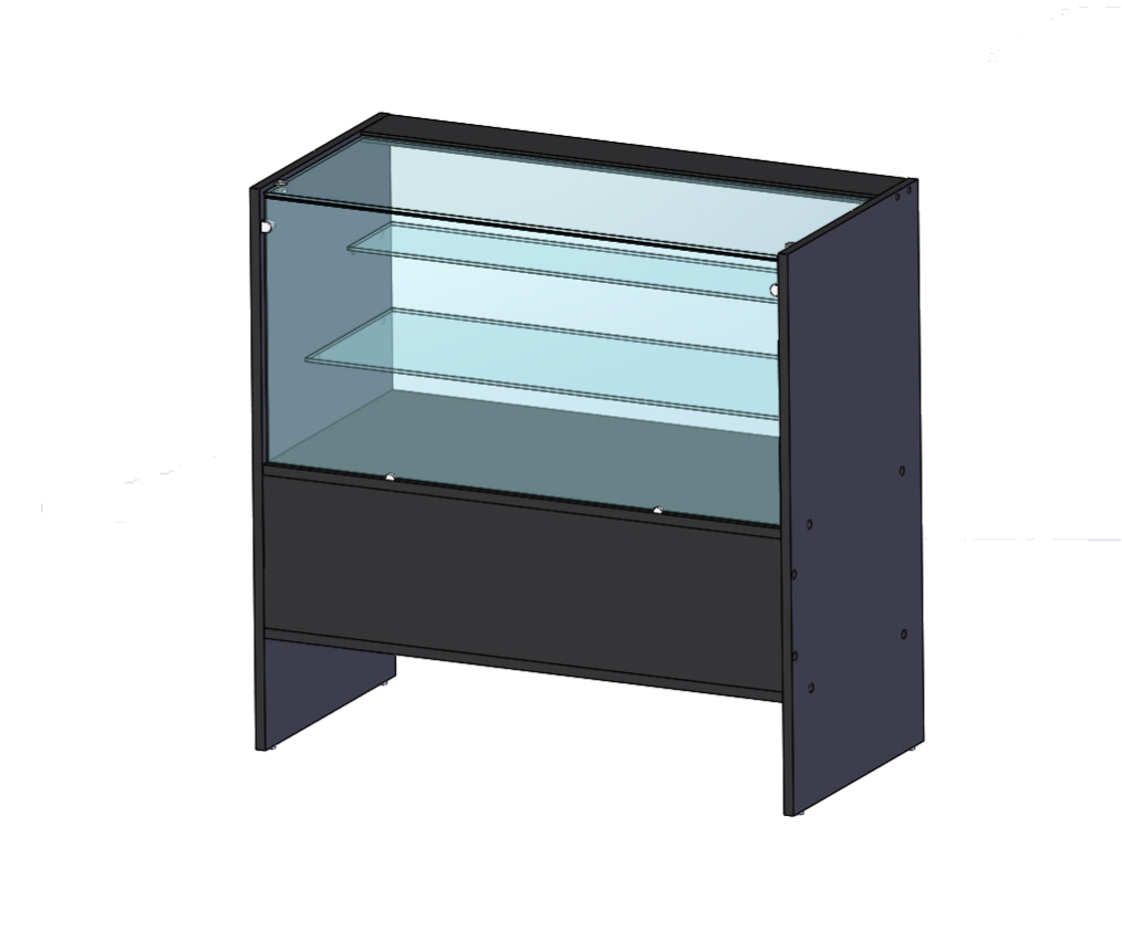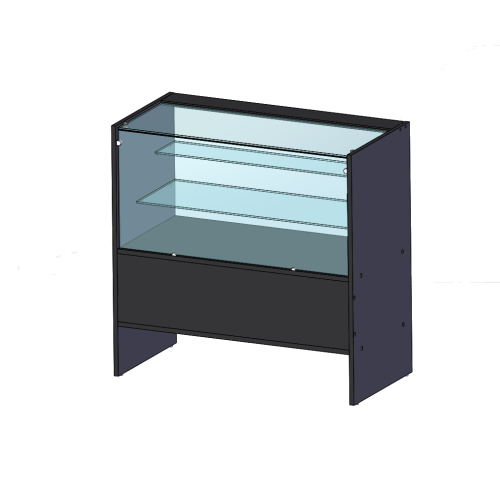 Прилавок из ДСП с верхней и фронтальной стеклянными поверхностями и стеклянными полками