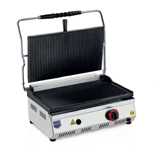 Посредством механической панели управления (двух переключателей) можно независимо регулировать нагрев верхней и нижней поверхностей. Тип подключения – LPG или природный газ, расход составляет 0,13 m3/h. Имеется регулятор подачи газа. Поджог газа происходит с помощью пьезоподжига (принцип действия которого – генерирование высоковольтных импульсов короткой продолжительности). Для безопасной эксплуатации гриль оснащен автоматической системой отключения подачи газа.