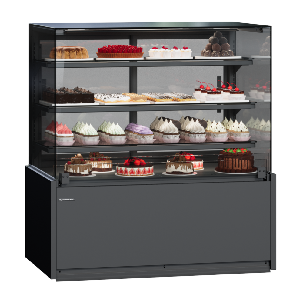 Витрина, в которой хранится насыпной товар, не может работать в динамическом режиме, поскольку такой товар хранится без упаковки. Специально для таких продуктов разработана система статического охлаждения: товары выкладываются в один уровень и охлаждение мягко подается из-под нижних сопел витрины. Таким образом минимизируются порча и обветренность товара, что в свою очередь очень влияет на презентабельный внешний вид продукта. Статическая система охлаждения позволяет не использовать упаковку продуктов, сохранять его товарный вид и свежесть продолжительное время. Такие витрины комплектуются высоким стеклом и предполагается наличие продавца для выдачи товара. Это витрины Quadros с высоким стеклом, причем стекло может быть как откидным, так и с пневмоподъемом для легкости обслуживания витрины и доступа к товару.
