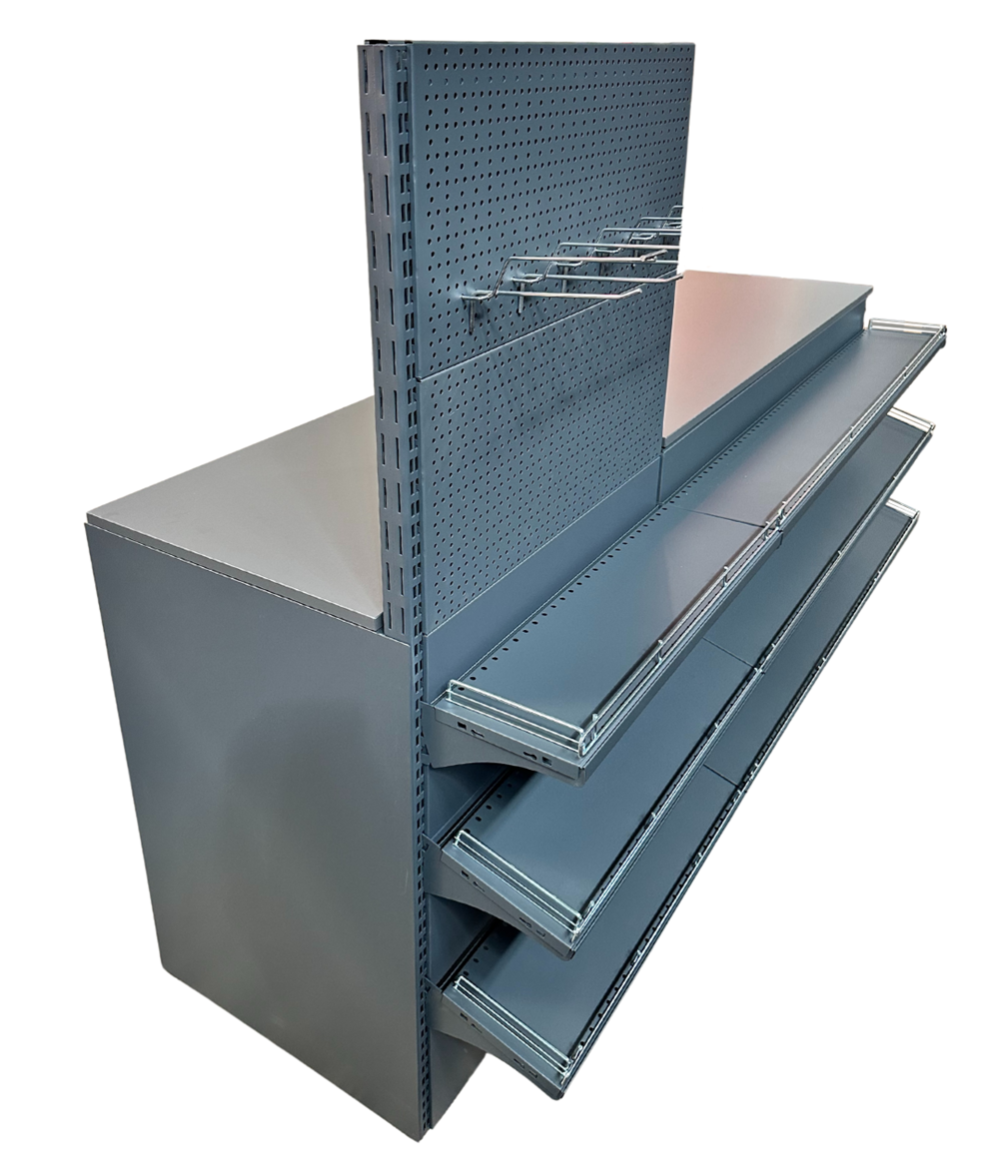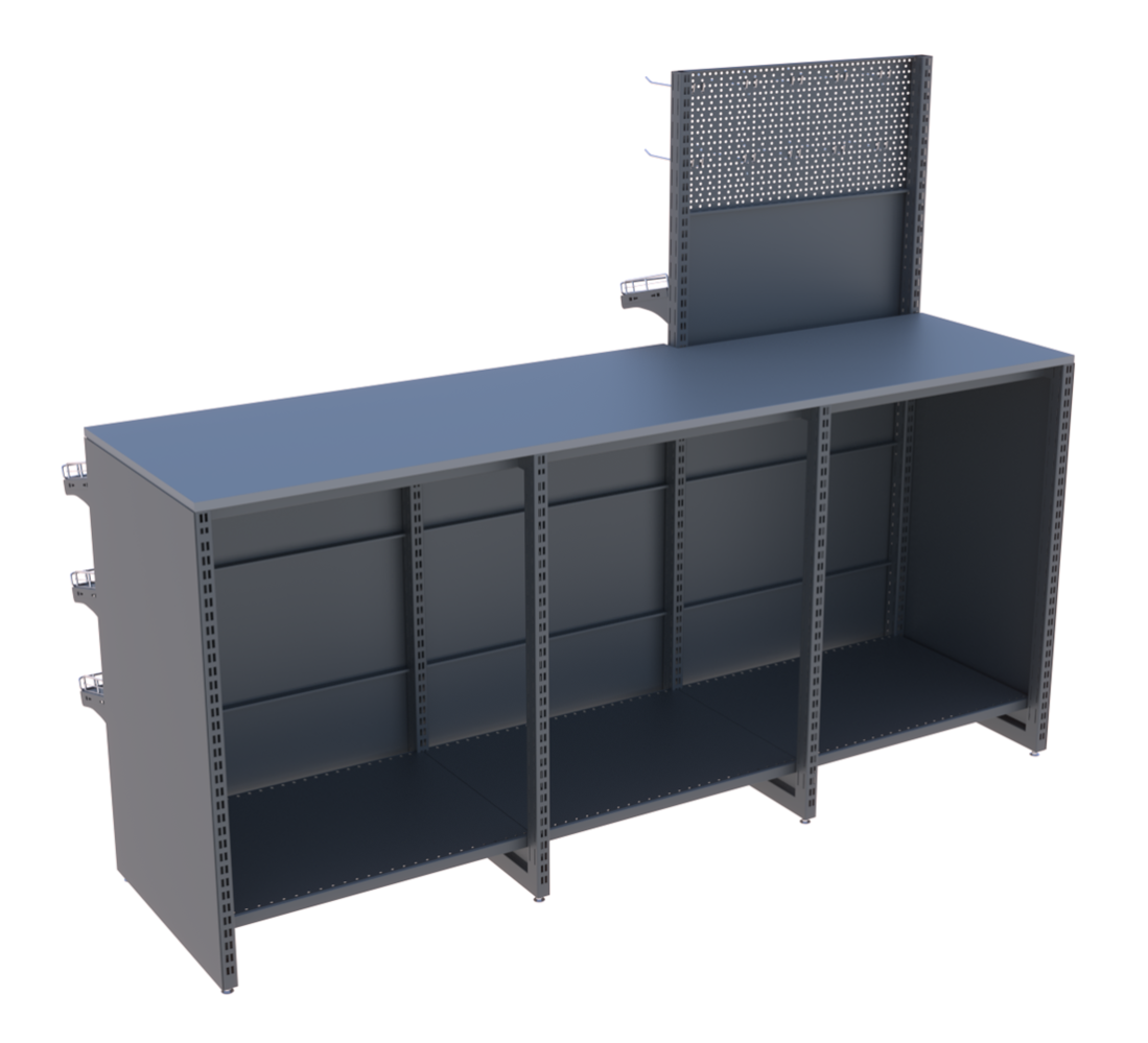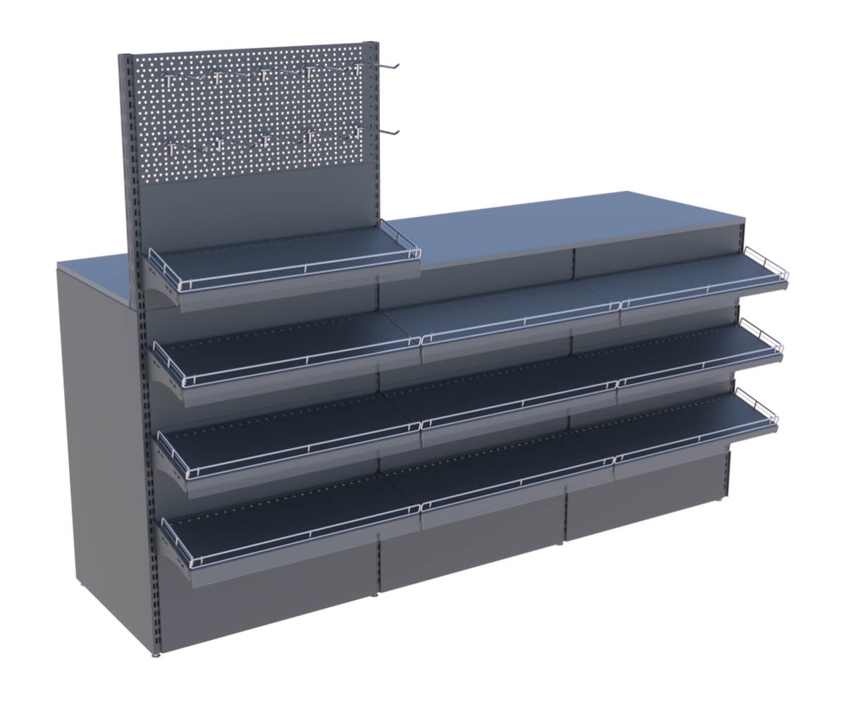| Комплектующие | металлический каркас, полки, кронштейны, передняя навеска, ценниковые планки, перегородки, боковины, столешница ДСП |