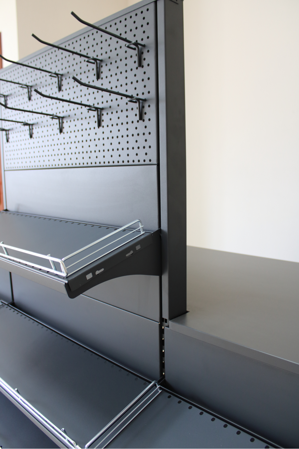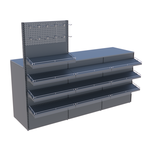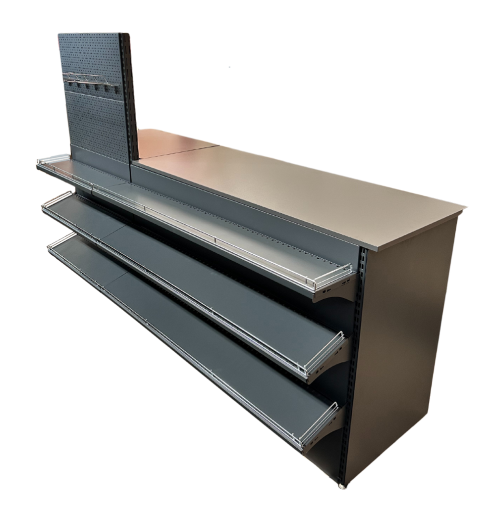 Данная прикассовая зона оснащена металлическими навесными полками и крючками, для размещения разнообрахных товаров от совсем мелких до более габартных. На крючки, которые встроены в перфорированную надставку, можно навешивать товары разного предназначения, но которые подстегивают покупателей на импульсные покупки.