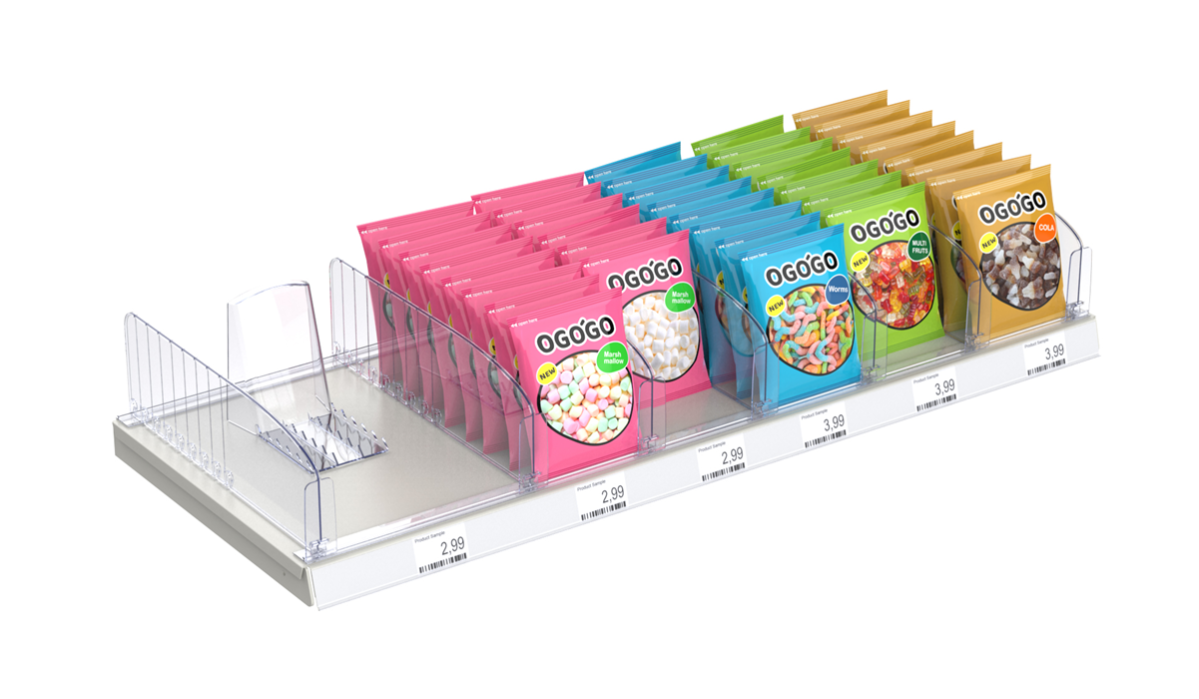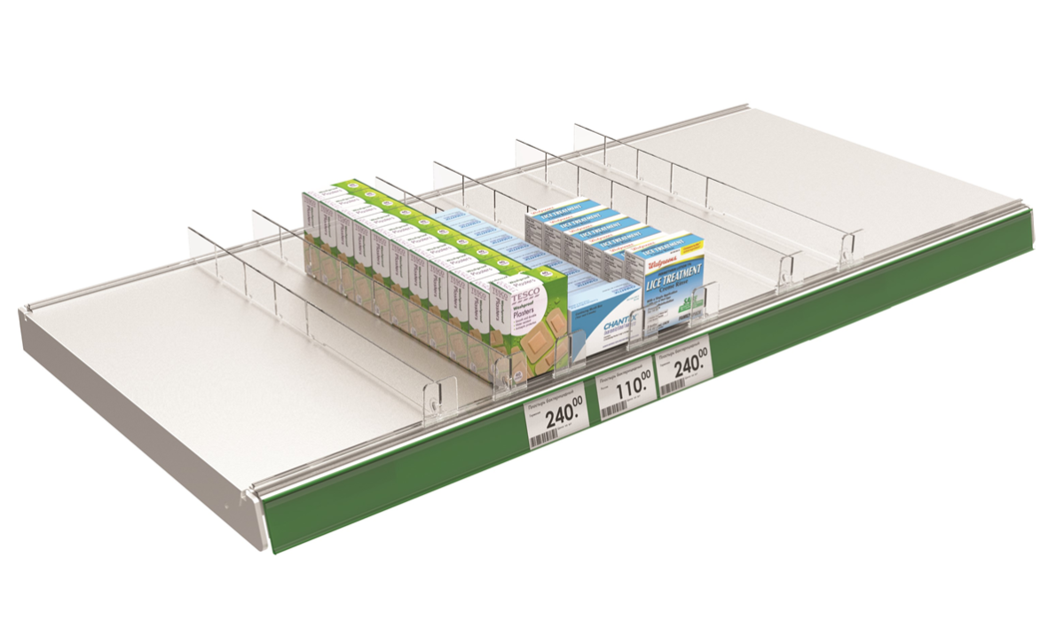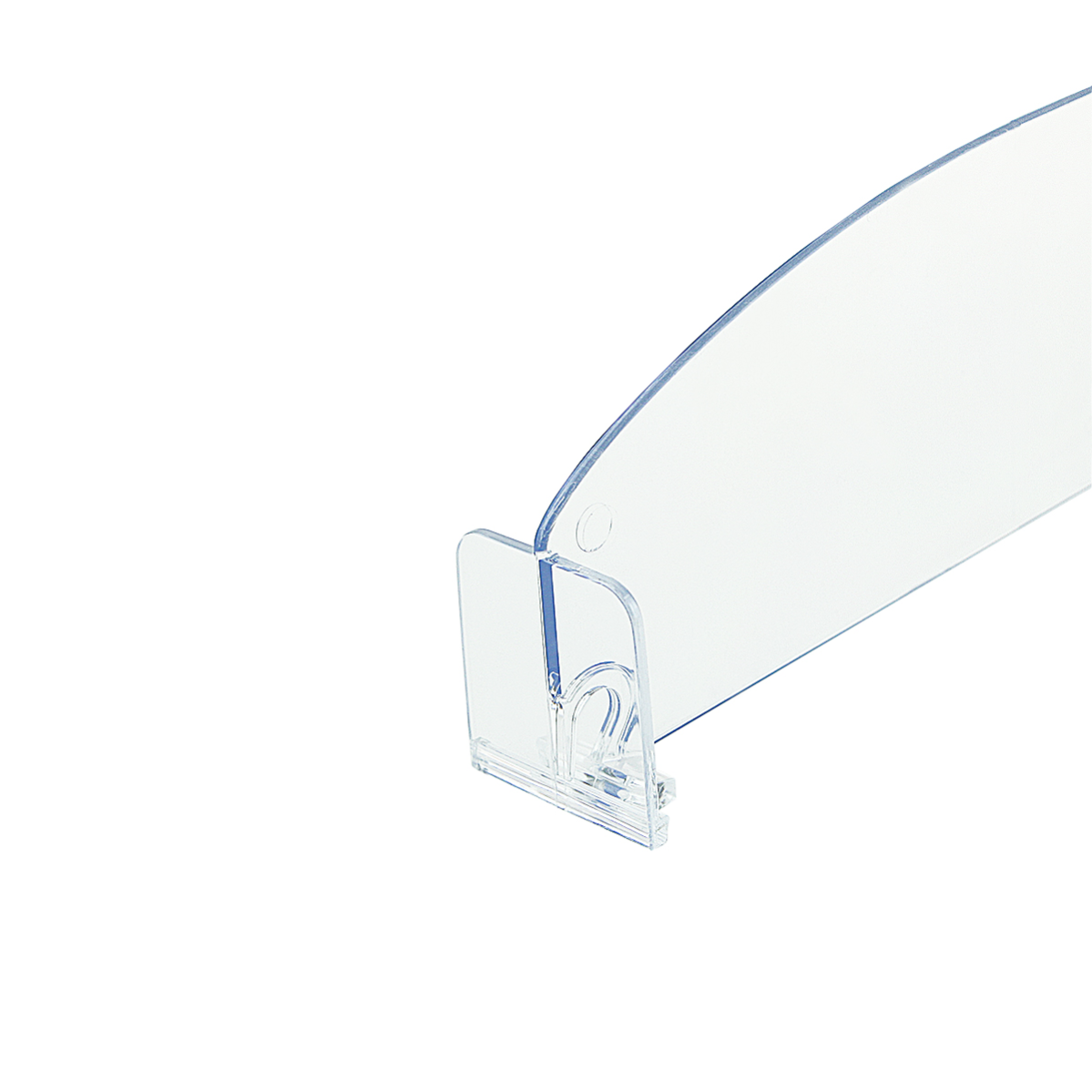 - Надежная фиксация товара: передний ограничитель удерживает продукцию на полке, предотвращая ее падение.
