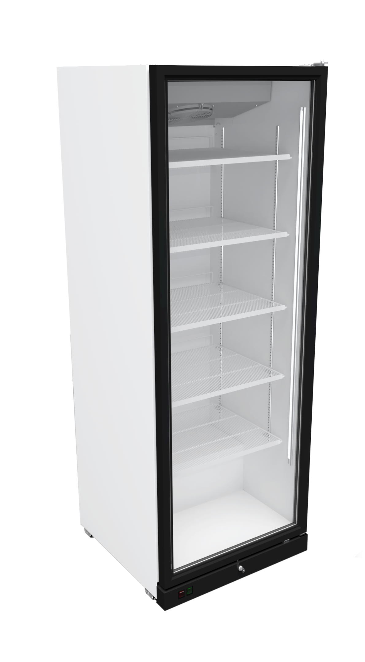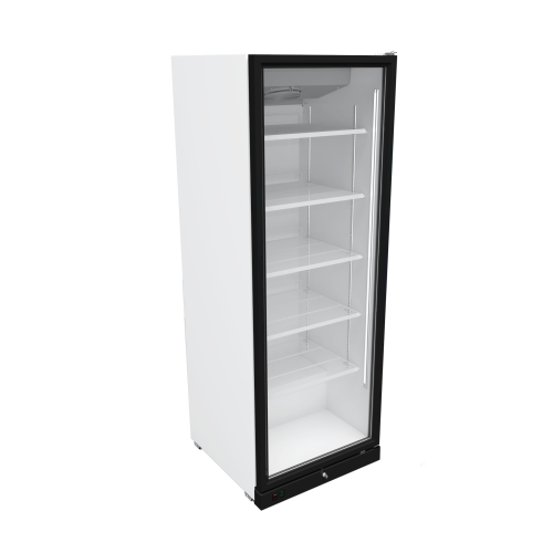 Каждая полка шкафа выдерживает до 57 килограммов нагрузки. Оборудование имеет современный дизайн со стеклянными дверцами, которые обеспечивают хороший обзор товаров на всех полках.