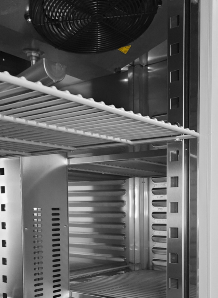Изготовлен шкаф из нержавеющей стали, что гарантирует отсутствие коррозии и легкость ухода. Автоматическая система размораживания лишит снежного налета и иния. Также для удобства находится панель управления. Шкаф оснащен динамическим типом охлаждения: вентиляторы циркулируя холодный воздух в шкафу, соблюдают на всех полках одинаковую температуру. Присутствует автоматическое ЛЭД-освещение внутри, когда дверь открыта для удобства использования.
