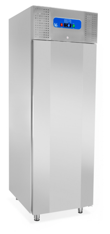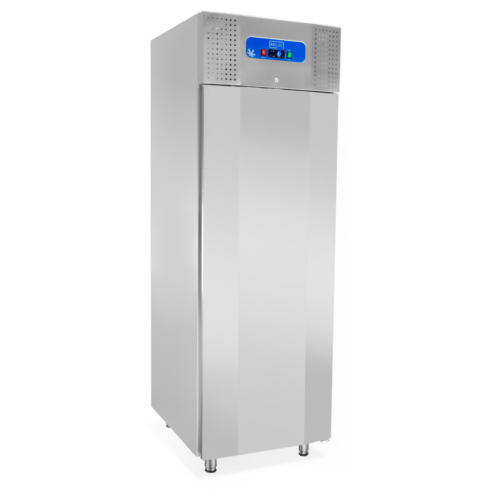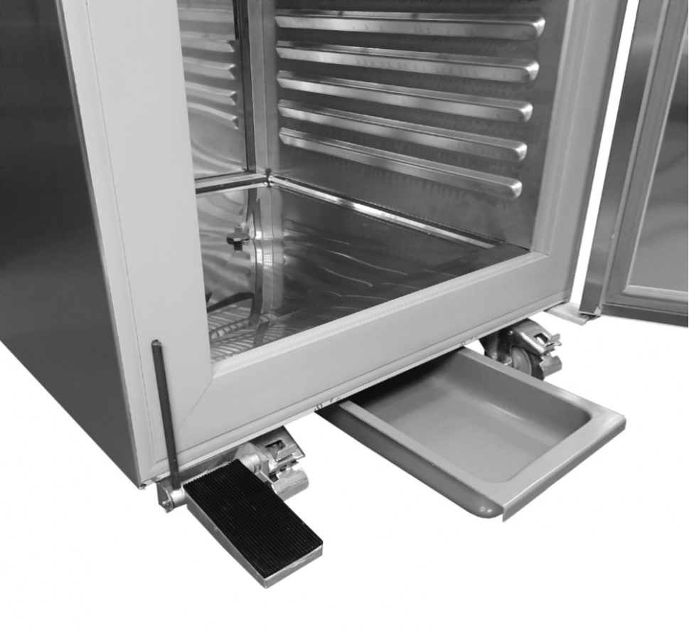 Оборудование имеет одну распашную дверь, поэтому подойдет для кухни среднего или малого размера. Внутренний объем – 700 литров. В середине находится три полки, размером подходящие для гастроемкости GN 2/1 (530 мм*650 мм). Всего в шкафу 26 уровней для полок, поэтому есть возможность регулировки количества или высоты. Дополнительное преимущество – динамическое охлаждение этой модели, поскольку эта функция обеспечивает одинаковую температуру на всех полках. Вентиляторы автоматически отключаются при открытии двери шкафа-холодильника.Снизу есть поддон, в который стекает вся жидкость из морозильного оборудования через отверстие внизу, что позволяет легко и удобно убрать всю жидкость. Важным аспектом является то, что можно настроить равновесие морозильного шкафа на неровной поверхности с помощью регуляции ножек.