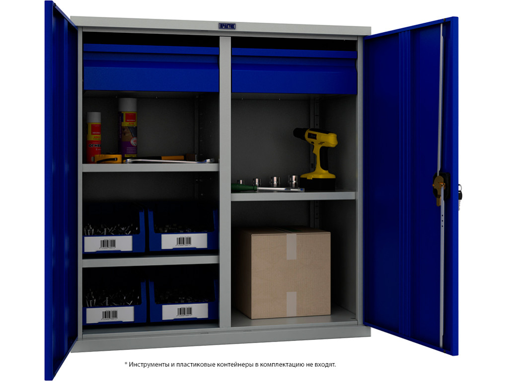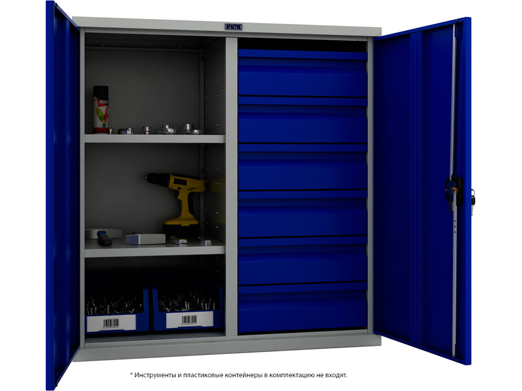 Также металлические шкафы для инструментов имеют уникальную конструкцию, которая позволяет устанавливать вертикально перегородку, разделяющую пространство шкафа на две части с возможностью комплектации малыми полками и ящиками.