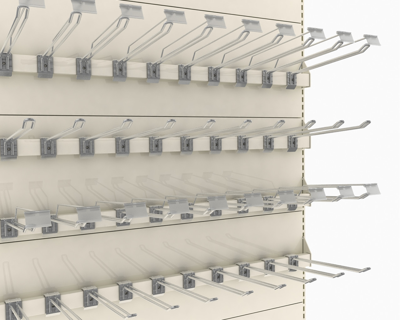 - Быстрый монтаж и замена конфигурации — конструкция позволяет легко менять расположение крючков в случае изменения ассортимента или сезонной ротации товара.